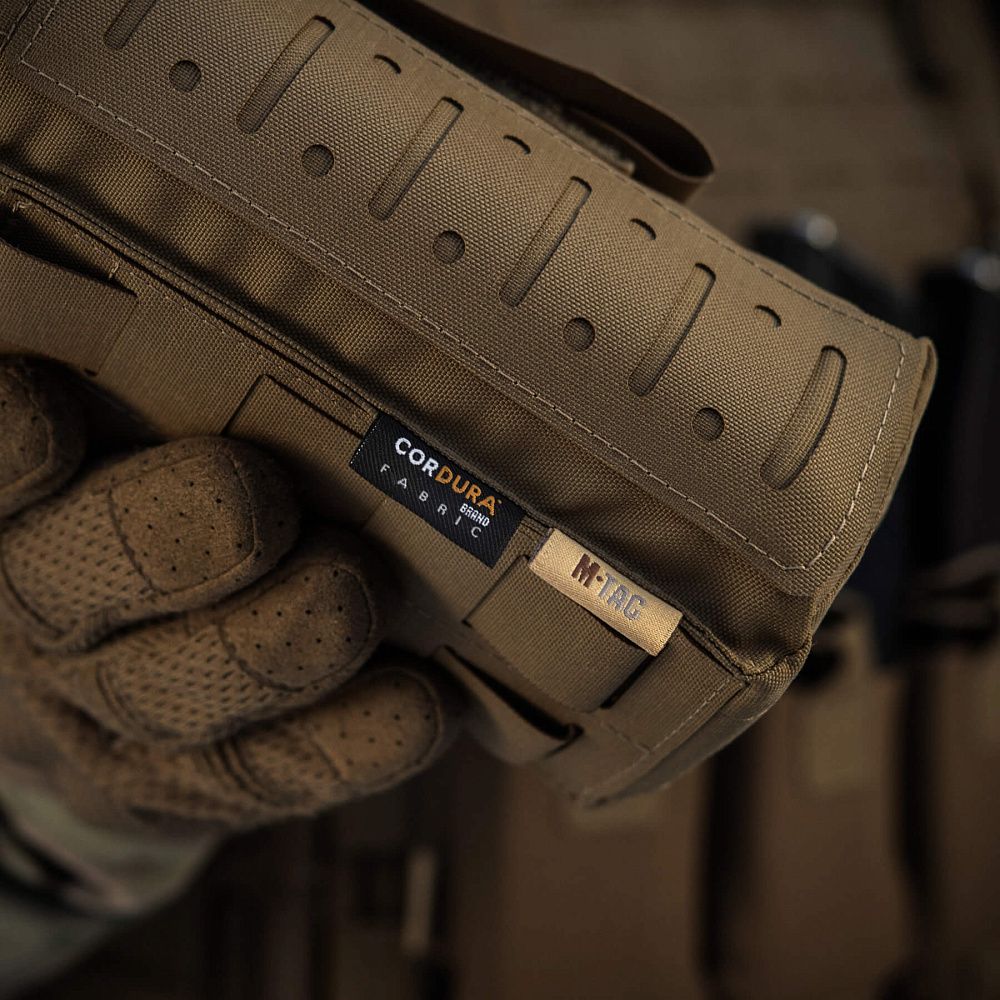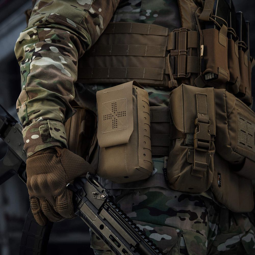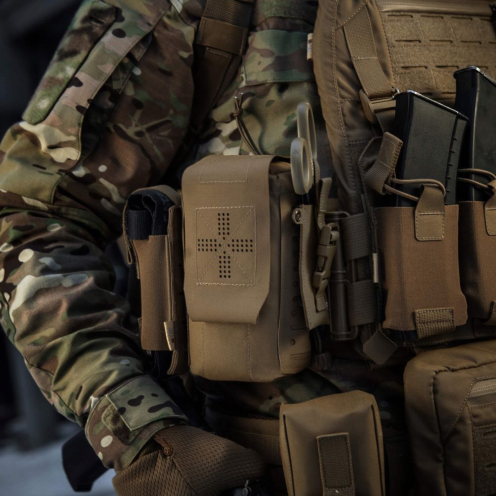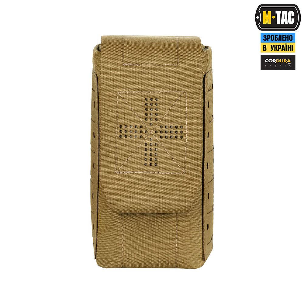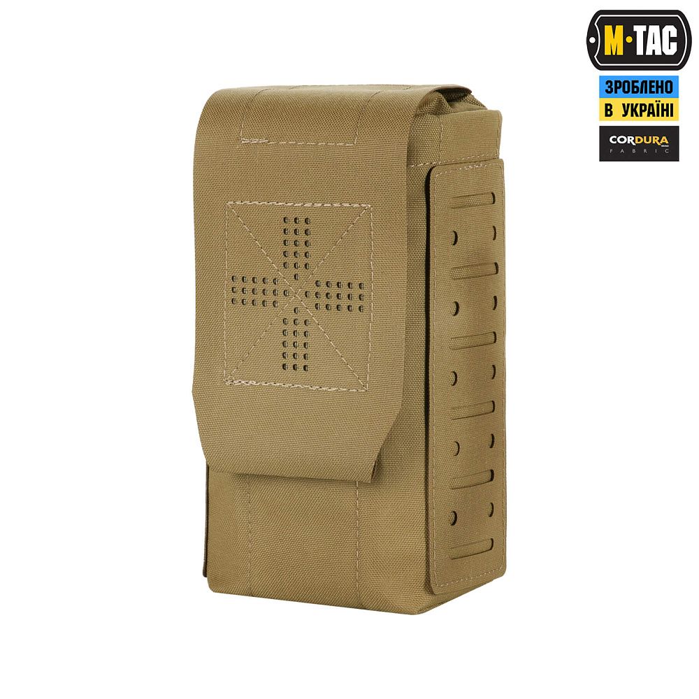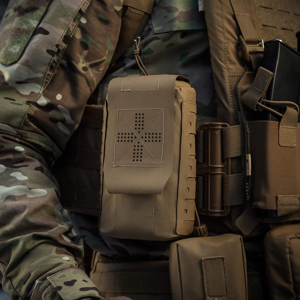 Зовнішній підсумок та внутрішній органайзер виготовлений із Cordura 500D – міцного матеріалу, стійкого до стирання та високих навантажень. Внутрішні бічні стінки обладнані нейлоновою стропою, завдяки якій підсумок добре тримає форму. Додатковим фіксуючим елементом є стяжка, яка дає змогу надійно утримувати аптечку. Підсумок кріпиться до спорядження за допомогою MOLLE інтерфейсу, виконаного за технологією Laser Cut.