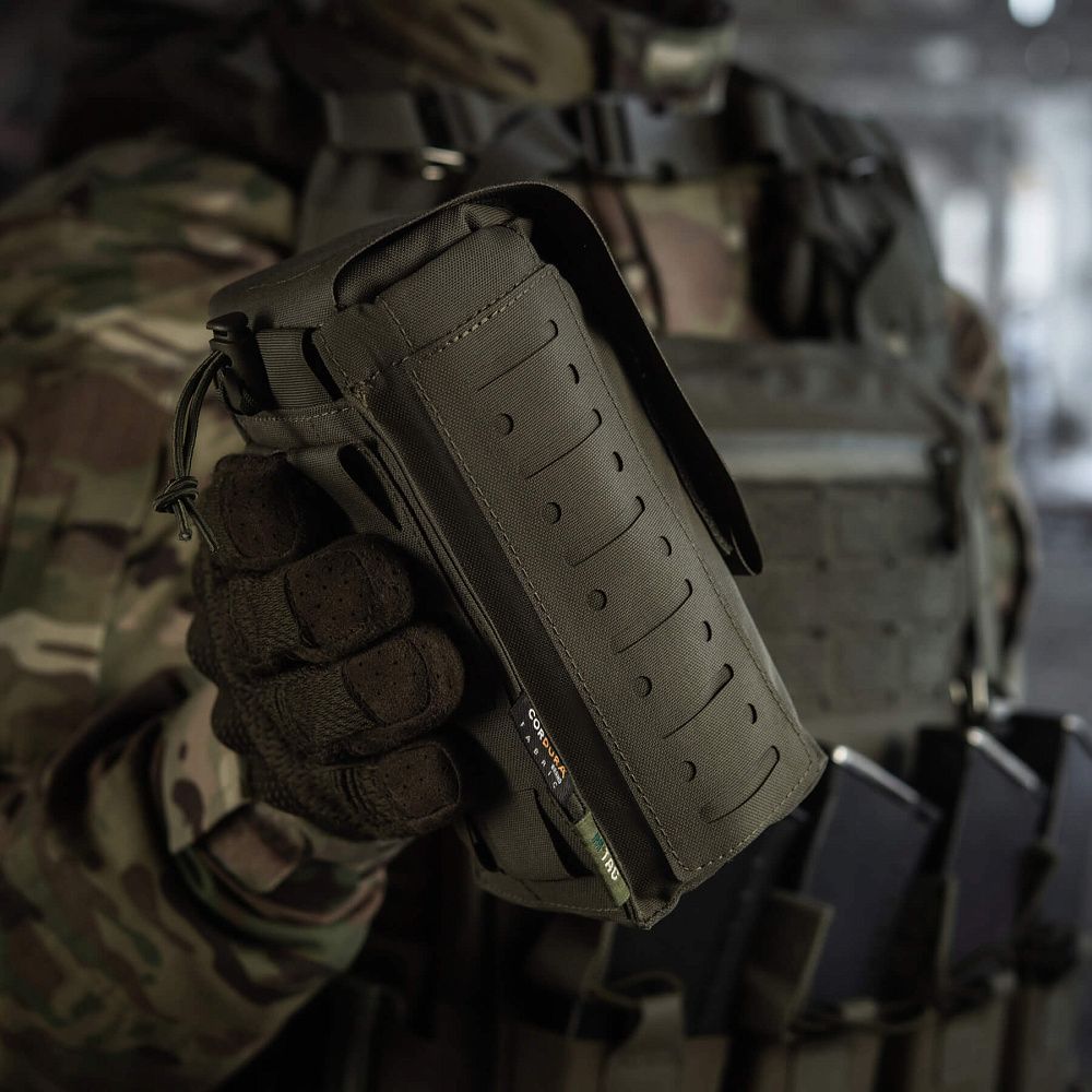 Зовнішній підсумок та внутрішній органайзер виготовлений із Cordura 500D – міцного матеріалу, стійкого до стирання та високих навантажень. Внутрішні бічні стінки обладнані нейлоновою стропою, завдяки якій підсумок добре тримає форму. Додатковим фіксуючим елементом є стяжка, яка дає змогу надійно утримувати аптечку. Підсумок кріпиться до спорядження за допомогою MOLLE інтерфейсу, виконаного за технологією Laser Cut.