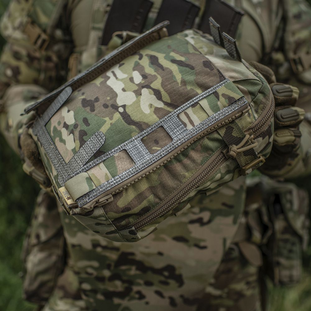 На передній частині підсумка розташована MOLLE панель, та еластичні резинки. За допомогою них можна прикріпити додаткове спорядження або речі, надійно їх закріпивши. Також, за допомогою еластичних резинок, можна максимально стягнути підсумок за відсутності у ньому вмісту.