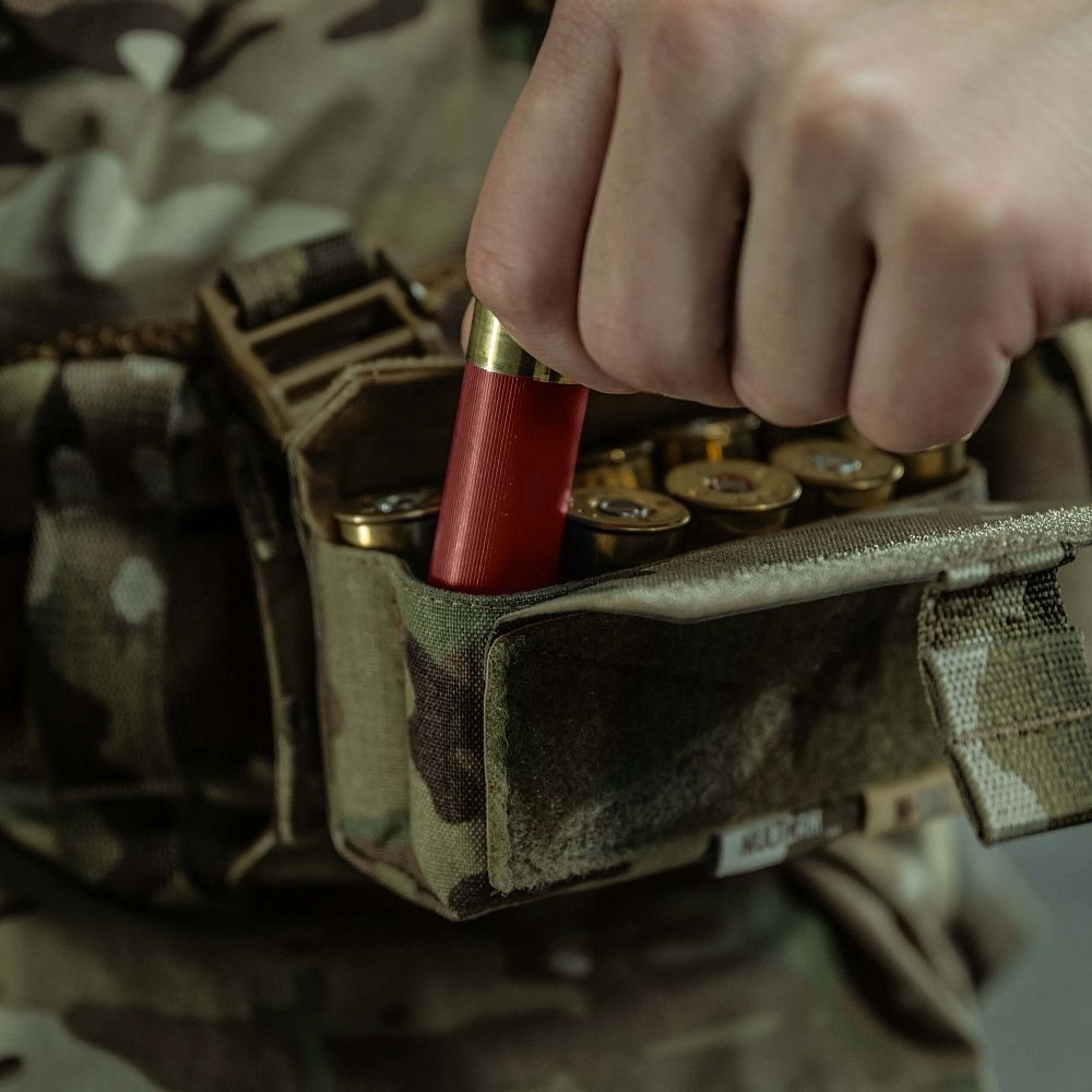M-Tac підсумок під 12 калібр на 10 набоїв Elite кріпиться до спорядження за допомогою подовженої задньої частини, яка вплітається у MOLLE систему. На передній частині підсумка розташована велкро-панель для кріплення ідентифікаторів та патчів, а знизу – люверси, які запобігають накопиченню пилу/бруду всередині. Для зручності відкривання, хлястик зі стропи додатково посилений пластиком.
