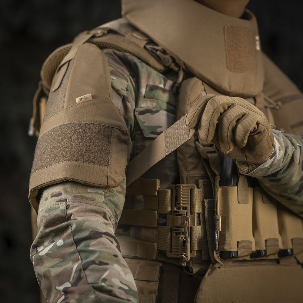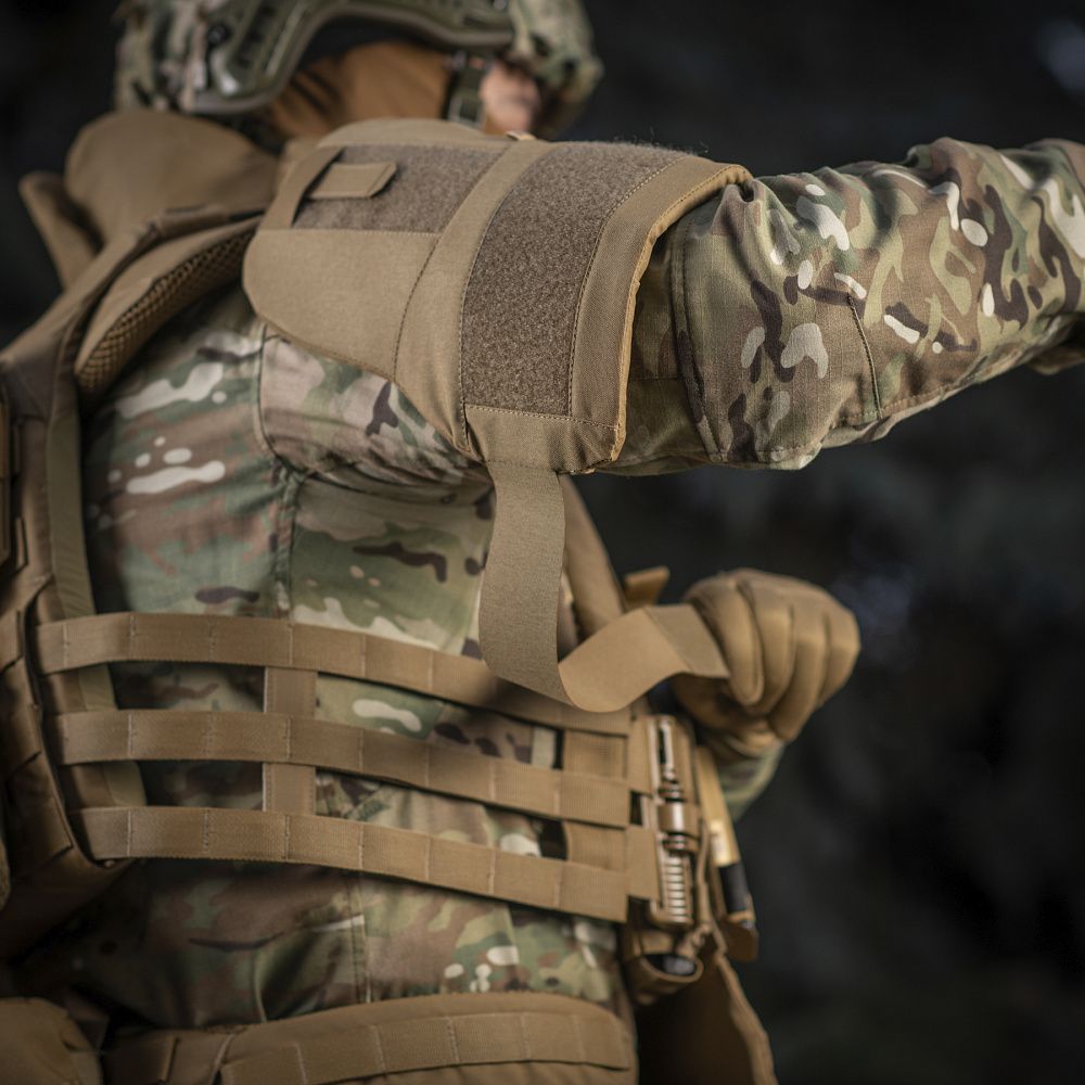 Ніколи не відомо, звідки прилетить ворожа куля чи уламки, тож варто заздалегідь максимально подбати про свою безпеку. Бренд М-Тас розробив плечовий захист з балістичними пакетами 1А для М-Тас плитоносок моделі Cuirass QRS, що значно збільшує площу захисту тіла бійця. Виріб являє собою компактний плечовий модуль, що забезпечує протиуламковий захист біцепса, плечового суглоба й артерій.