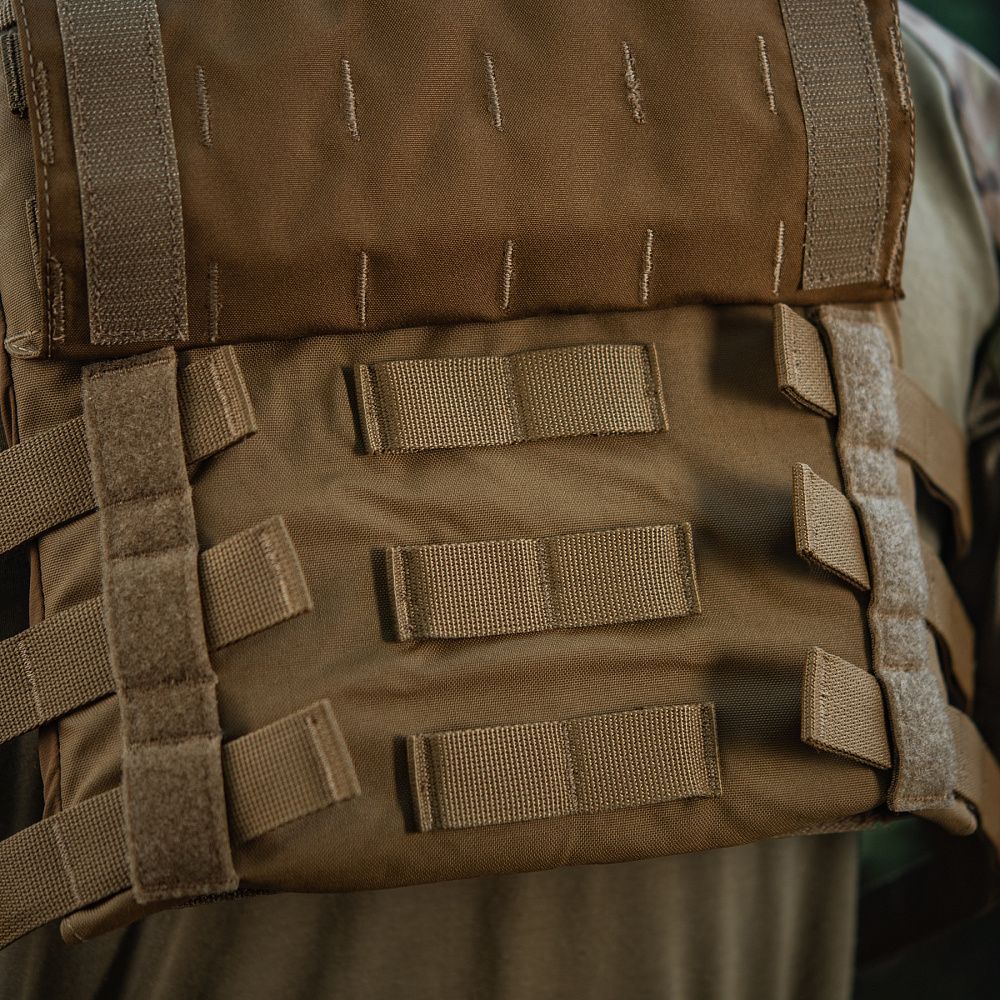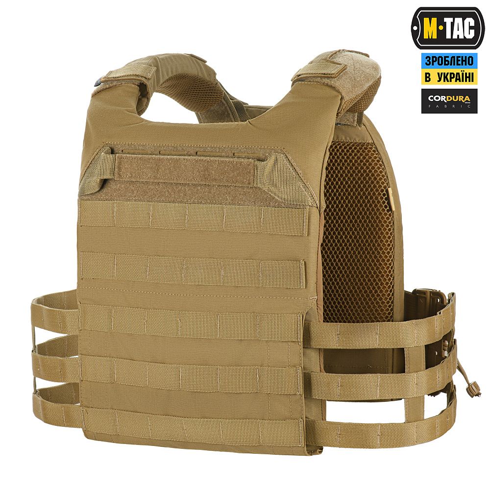 Плитоноска виготовлена з високоякісного матеріалу Cordura 500D – надміцної тканини, стійкої до стирання і високих навантажень. З внутрішньої сторони плитоноски є вставки з 3D сітки, які забезпечують амортизацію і циркуляцію повітря. Скелетоподібний камербанд значно зменшує вагу виробу і при необхідності дозволяє розмістити підсумки.