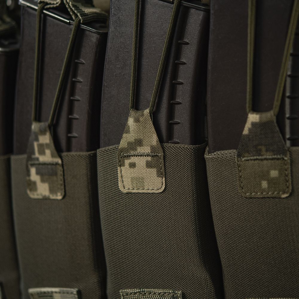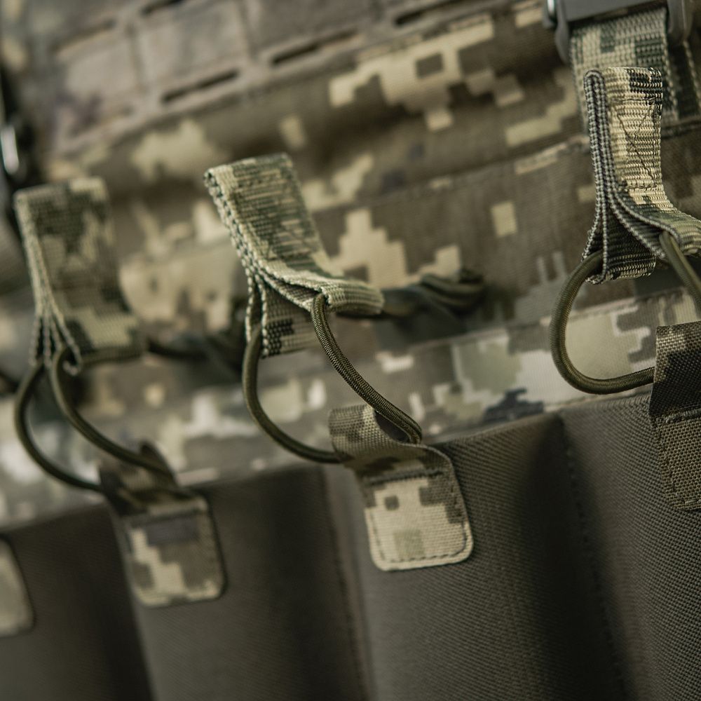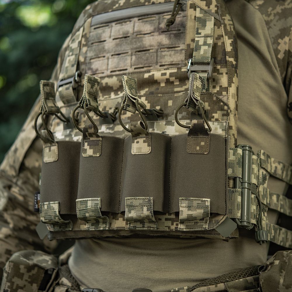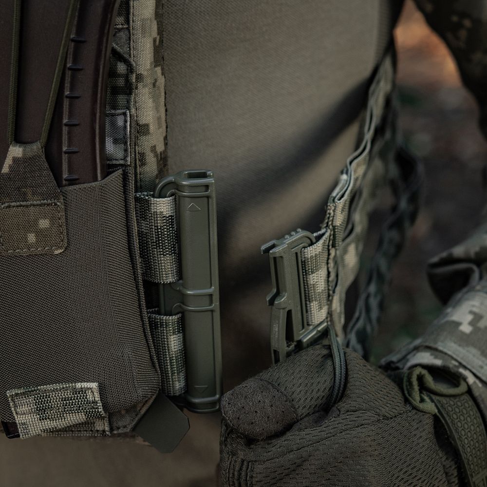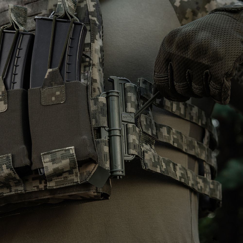 Знизу бронежилета знаходиться швидкознімний модуль з 4 підсумками, які надійно утримують магазини. Щоб уникнути випадкового зривання з основи Velcro, він кріпиться до строп на плитоносці за допомогою карабінів Woojin.