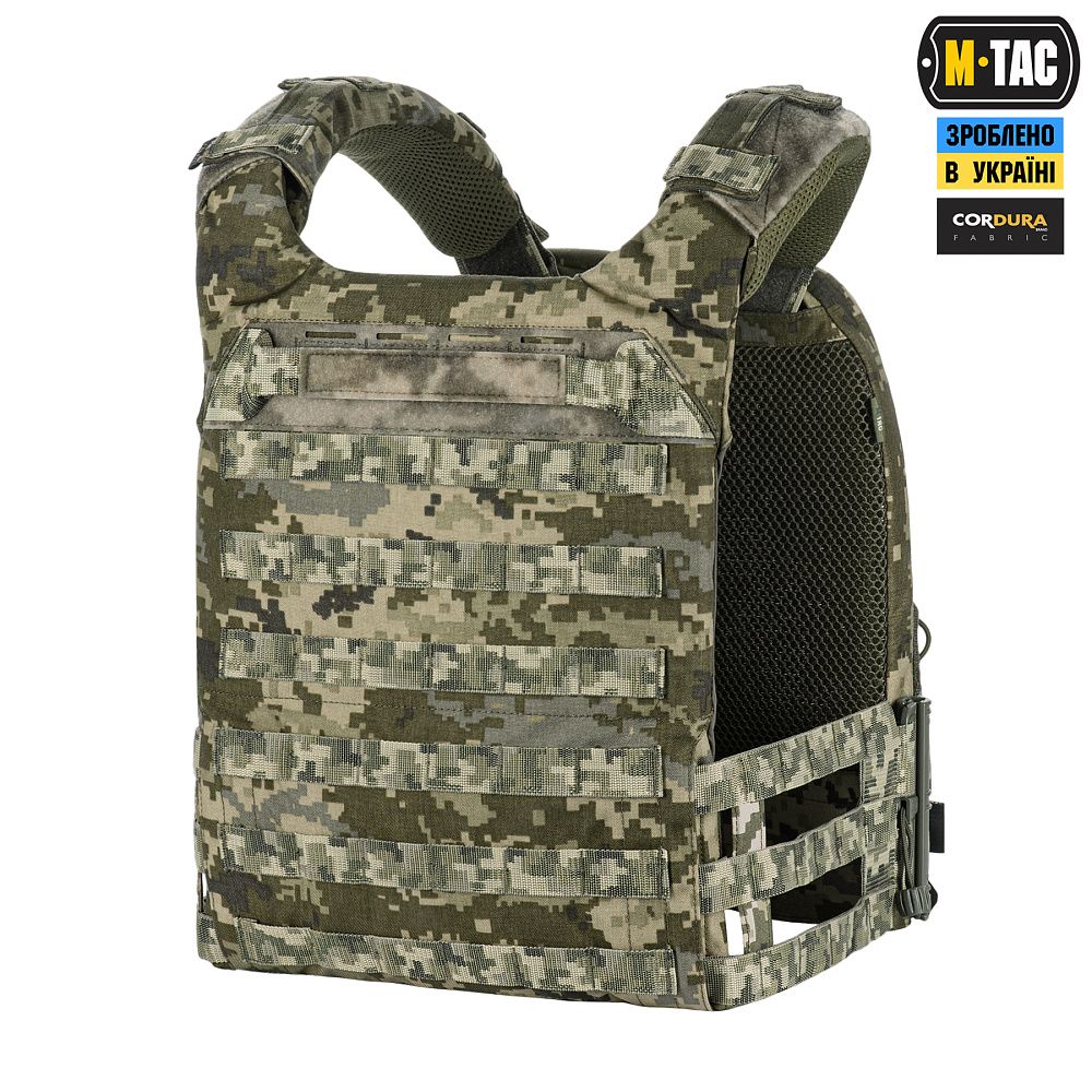 Виготовлена з високоякісного матеріалу Cordura 500D – надміцної тканини, стійкої до стирання і високих навантажень. З внутрішньої сторони плитоноски є вставки з 3D сітки, які забезпечують амортизацію та циркуляцію повітря. Ергономічні плечові лямки зручні у використанні й органічно повторюють контури тіла. Скелетоподібний камербанд значно зменшує вагу виробу і при необхідності дозволяє розмістити підсумки.