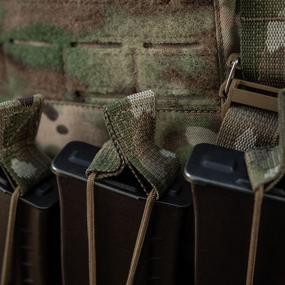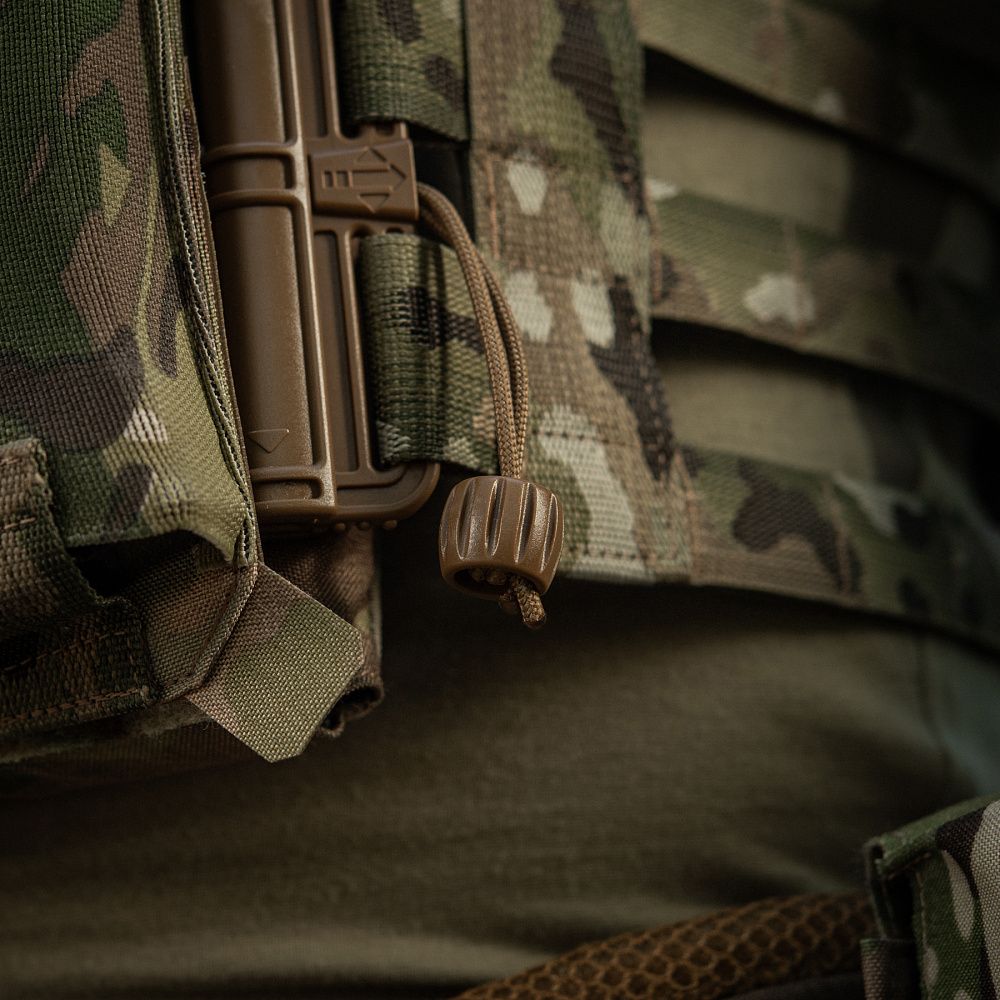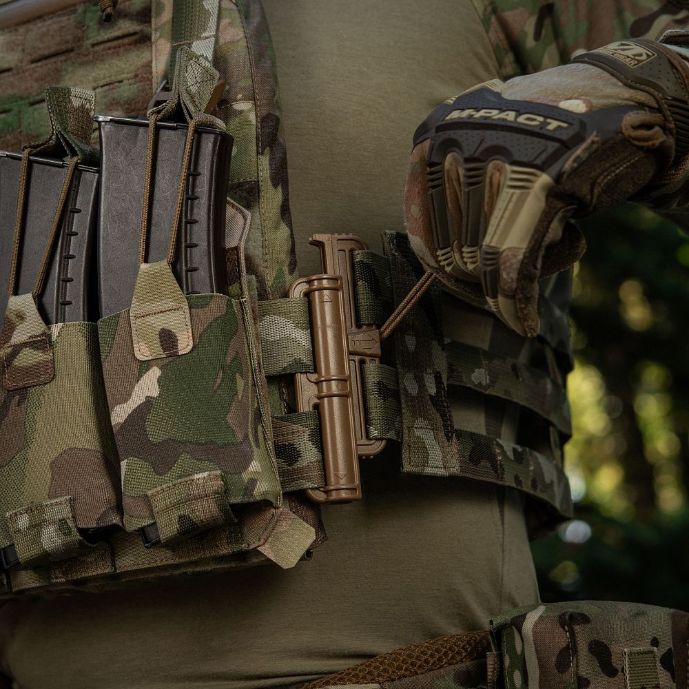 Знизу бронежилета знаходиться швидкознімний модуль з 4 підсумками, які надійно утримують магазини. Щоб уникнути випадкового зривання з основи Velcro, він кріпиться до строп на плитоносці за допомогою карабінів Woojin.