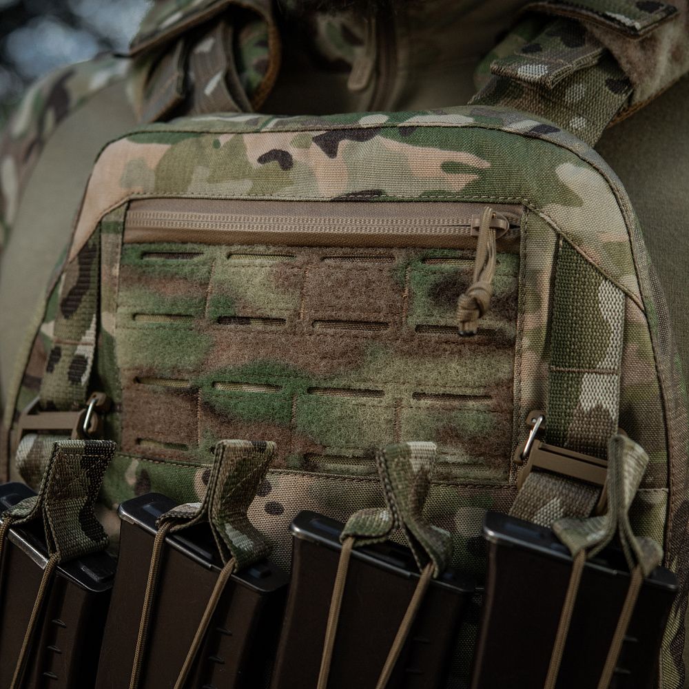 На фронтальній частині виробу знаходиться Velcro-панель з прорізами, на яку можна закріпити молле-сумісне спорядження та ID-ідентифікатори. Вгорі плитоноски дизайнери бренду передбачили невелике адміністративне відділення на вологозахисній блискавці AquaGuard. Дана кишеня розрахована на зберігання невеликих плоских речей, таких як посвідчення, ключі, запальничка та інші предмети.