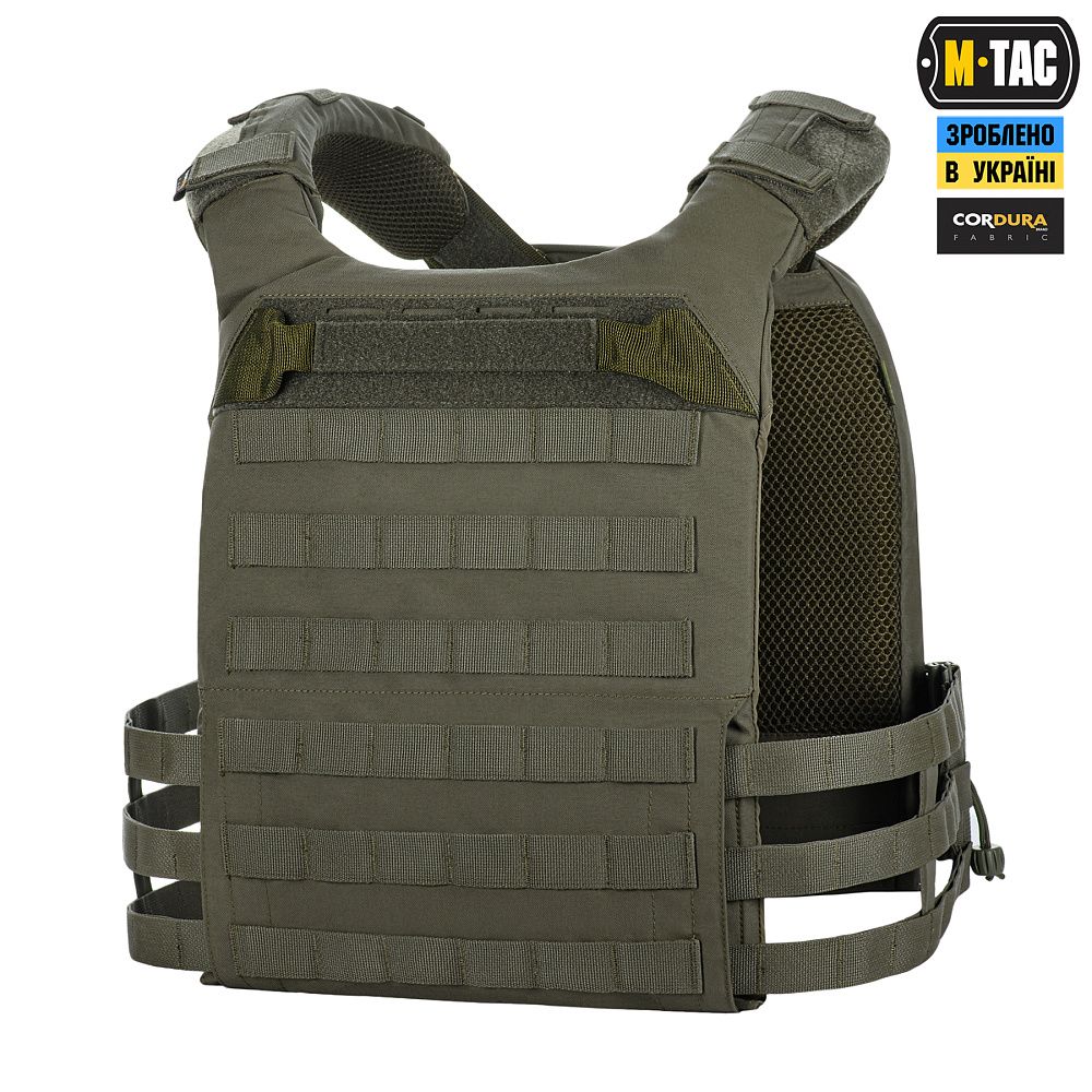 Виготовлена з високоякісного матеріалу Cordura 500D – надміцної тканини, стійкої до стирання і високих навантажень. З внутрішньої сторони плитоноски є вставки з 3D сітки, які забезпечують амортизацію та циркуляцію повітря. Ергономічні плечові лямки зручні у використанні й органічно повторюють контури тіла. Скелетоподібний камербанд значно зменшує вагу виробу і при необхідності дозволяє розмістити підсумки.