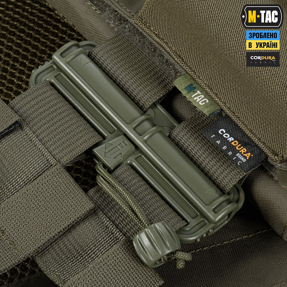 Знизу бронежилета знаходиться швидкознімний модуль з 4 підсумками, які надійно утримують магазини. Щоб уникнути випадкового зривання з основи Velcro, він кріпиться до строп на плитоносці за допомогою карабінів Woojin.