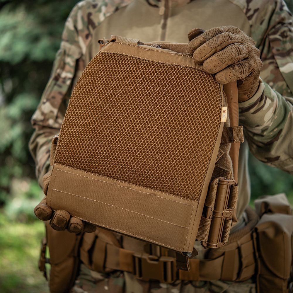 Плитоноска виготовлена з високоякісного матеріалу Cordura 500D – надміцного матеріалу, стійкого до стирання і високих навантажень. З внутрішньої частини є вставки з 3D сітки, які забезпечують амортизацію та циркуляцію повітря. Ергономічні плечові лямки зручні у використанні й органічно повторюють контури тіла. Скелетоподібний камербанд значно зменшує вагу виробу і при необхідності дозволяє розмістити підсумки.