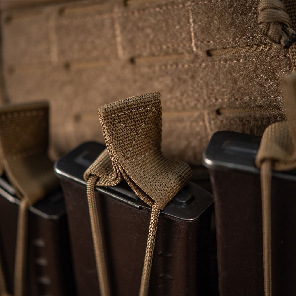 Знизу плитоноски знаходиться швидкозніма панель з 3 підсумками, які надійно утримують магазини. Щоб уникнути випадкового зривання з основи Velcro, вона кріпиться до строп на плитоносці за допомогою карабінів Woojin.