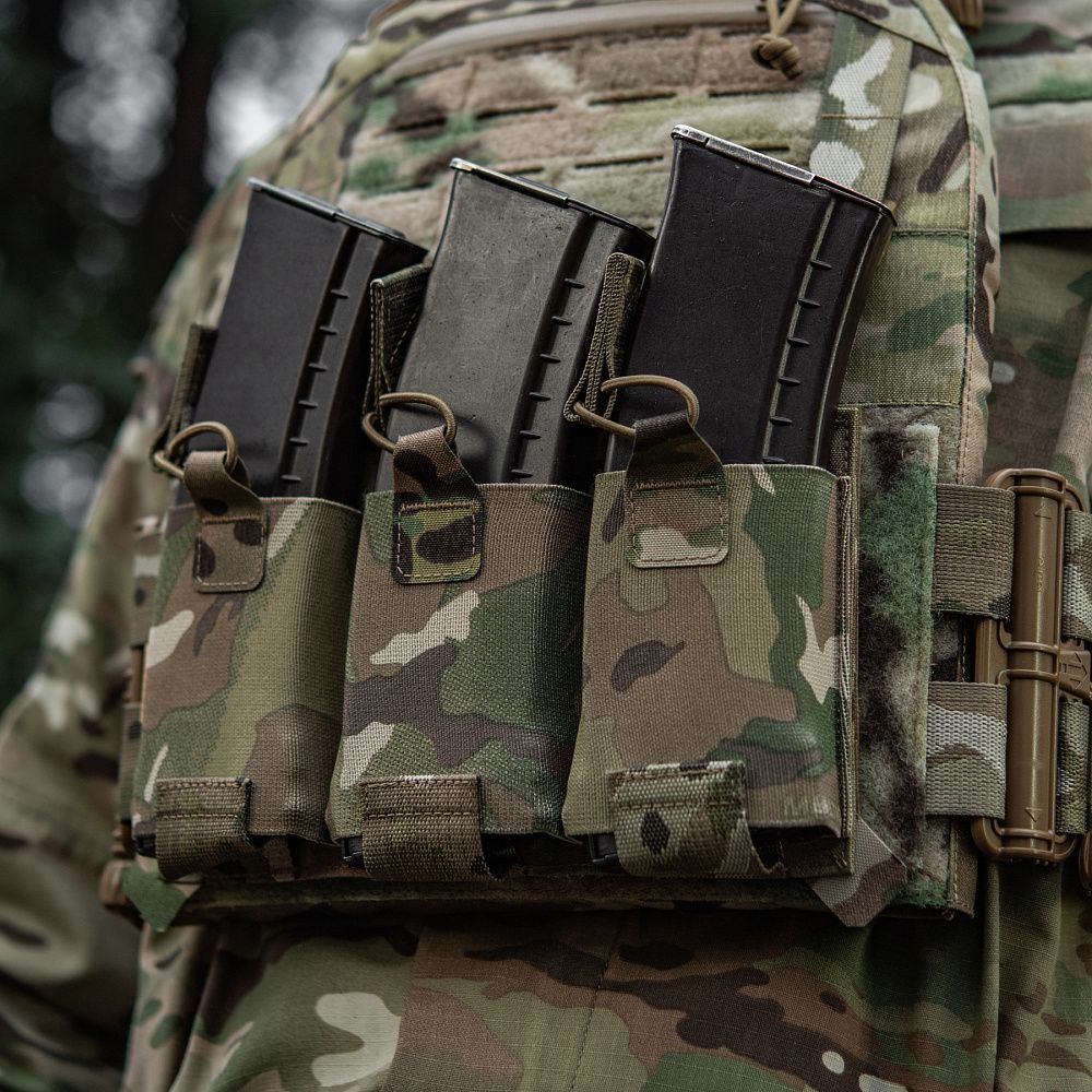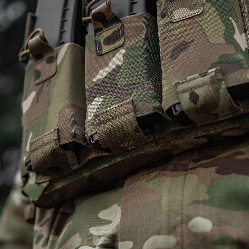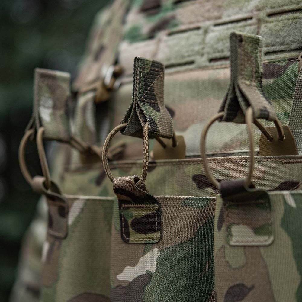 Знизу плитоноски знаходиться швидкозніма панель з 3 підсумками, які надійно утримують магазини. Щоб уникнути випадкового зривання з основи Velcro, вона кріпиться до строп на плитоносці за допомогою карабінів Woojin.