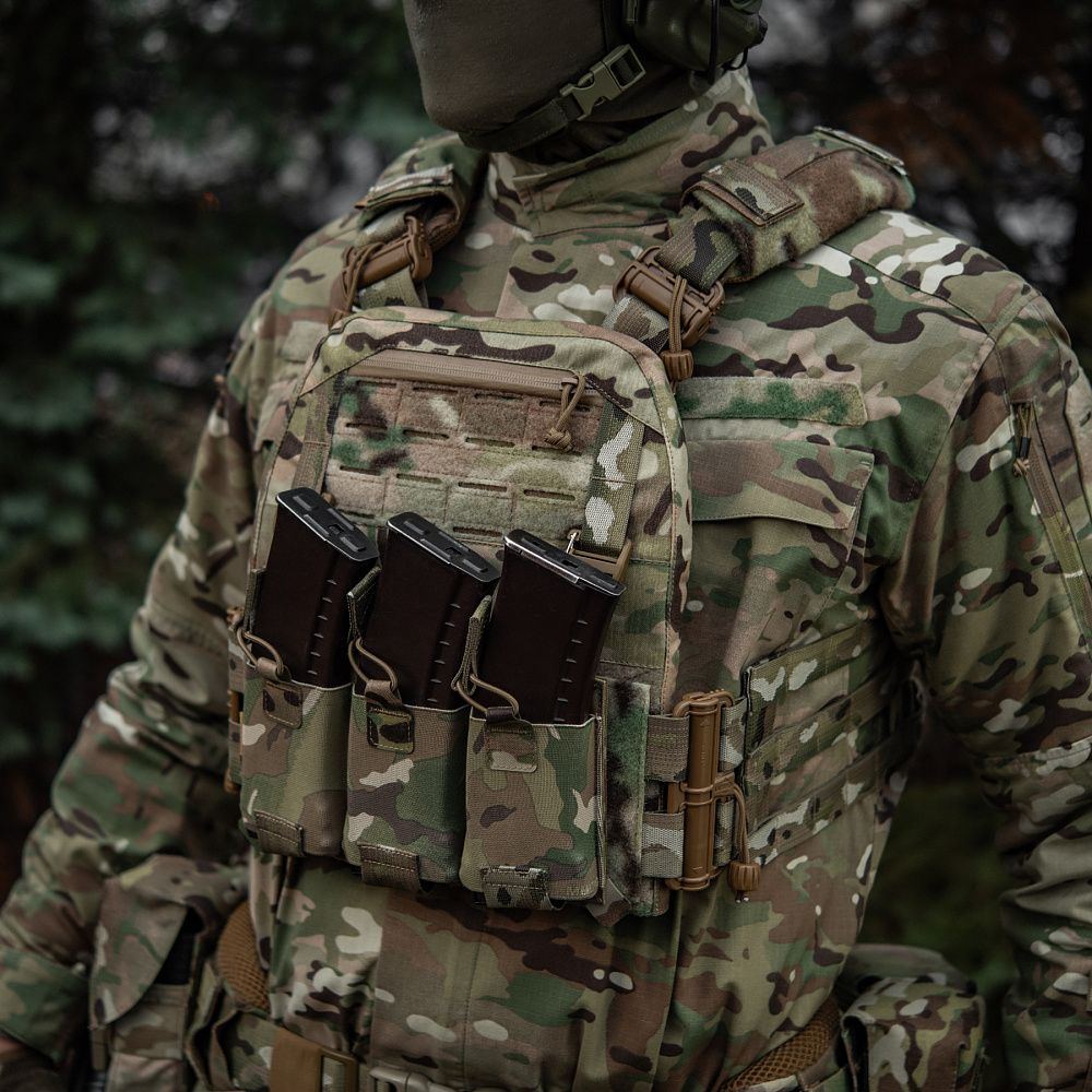 На фронтальній частині виробу знаходиться Velcro-панель з прорізами, на яку можна закріпити Molle-сумісне спорядження та ID-ідентифікатори. Вгорі плитоноски дизайнери бренду передбачили невелике адміністративне відділення на вологозахисній блискавці AquaGuard. Дана кишеня розрахована на зберігання невеликих плоских речей, таких як посвідчення, ключі, запальничка та інші предмети.