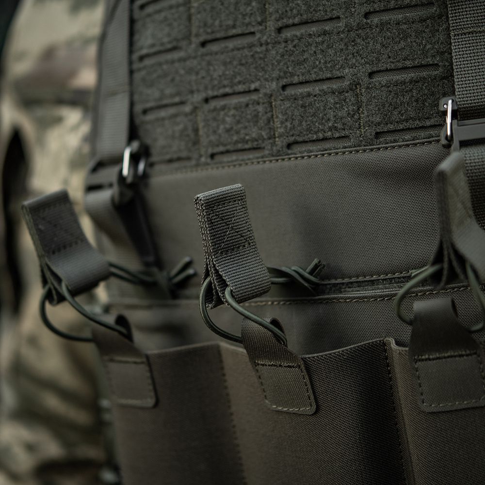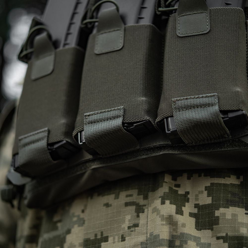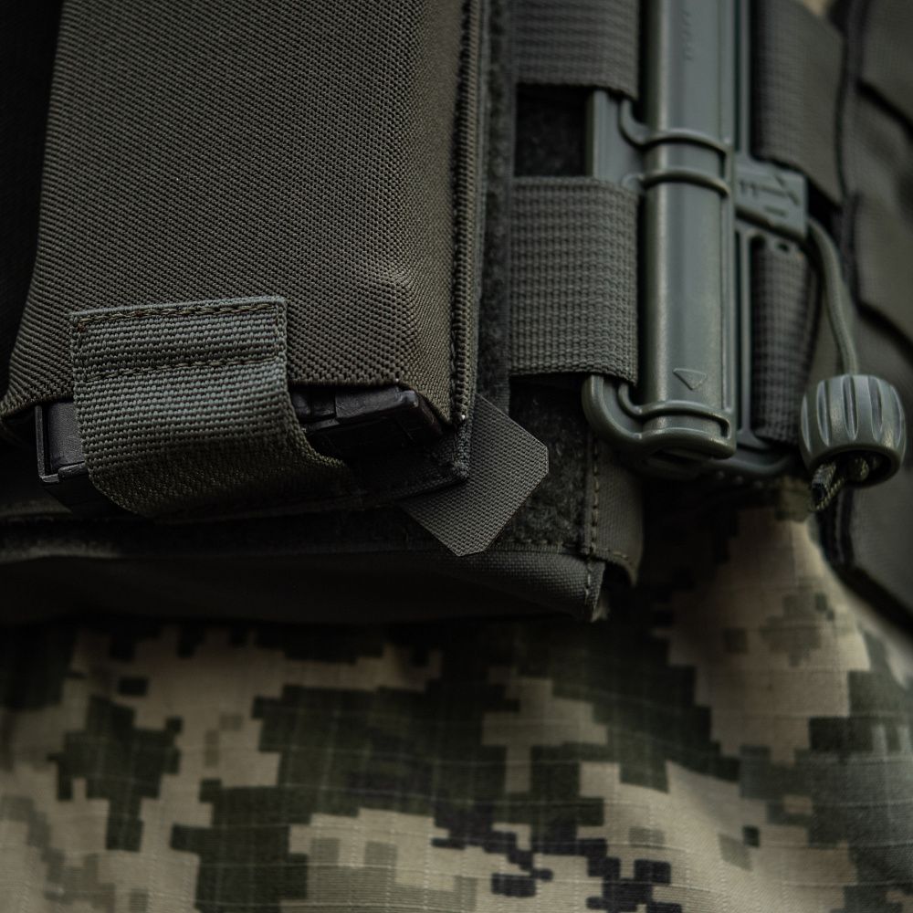 Знизу плитоноски знаходиться швидкозніма панель з 3 підсумками, які надійно утримують магазини. Щоб уникнути випадкового зривання з основи Velcro, вона кріпиться до строп на плитоносці за допомогою карабінів Woojin.