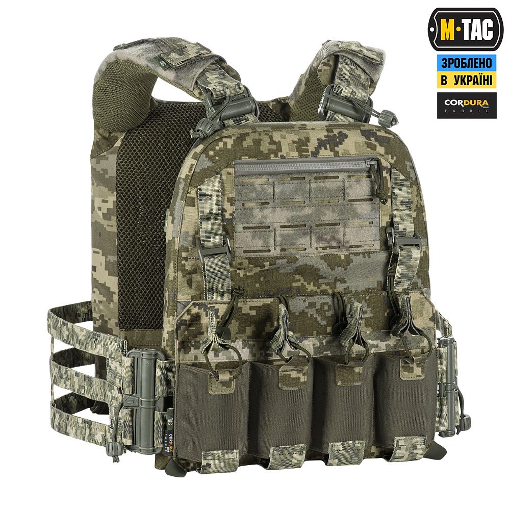 Плитоноска виготовлена з високоякісного матеріалу Cordura 500D – надміцної тканини, стійкої до стирання і високих навантажень. З внутрішньої сторони є вставки з 3D сітки, які забезпечують амортизацію та циркуляцію повітря. Ергономічні плечові лямки зручні у використанні й органічно повторюють контури тіла. Скелетоподібний камербанд значно зменшує вагу виробу і при необхідності дозволяє розмістити підсумки.