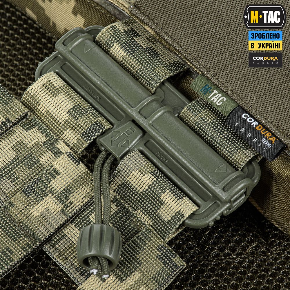 Знизу бронежилета знаходиться швидкознімний модуль з 4 підсумками, які надійно утримують магазини. Щоб уникнути випадкового зривання з основи Velcro, він кріпиться до строп на плитоносці за допомогою карабінів Woojin.