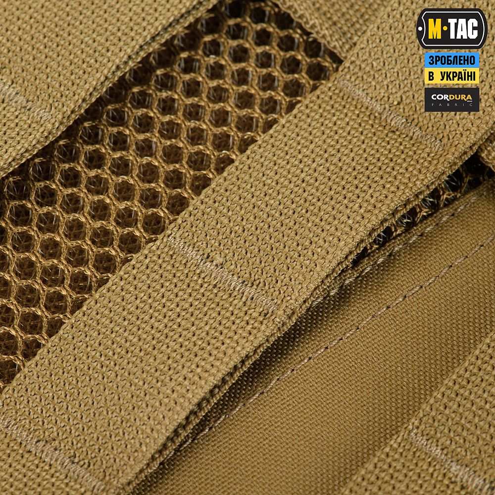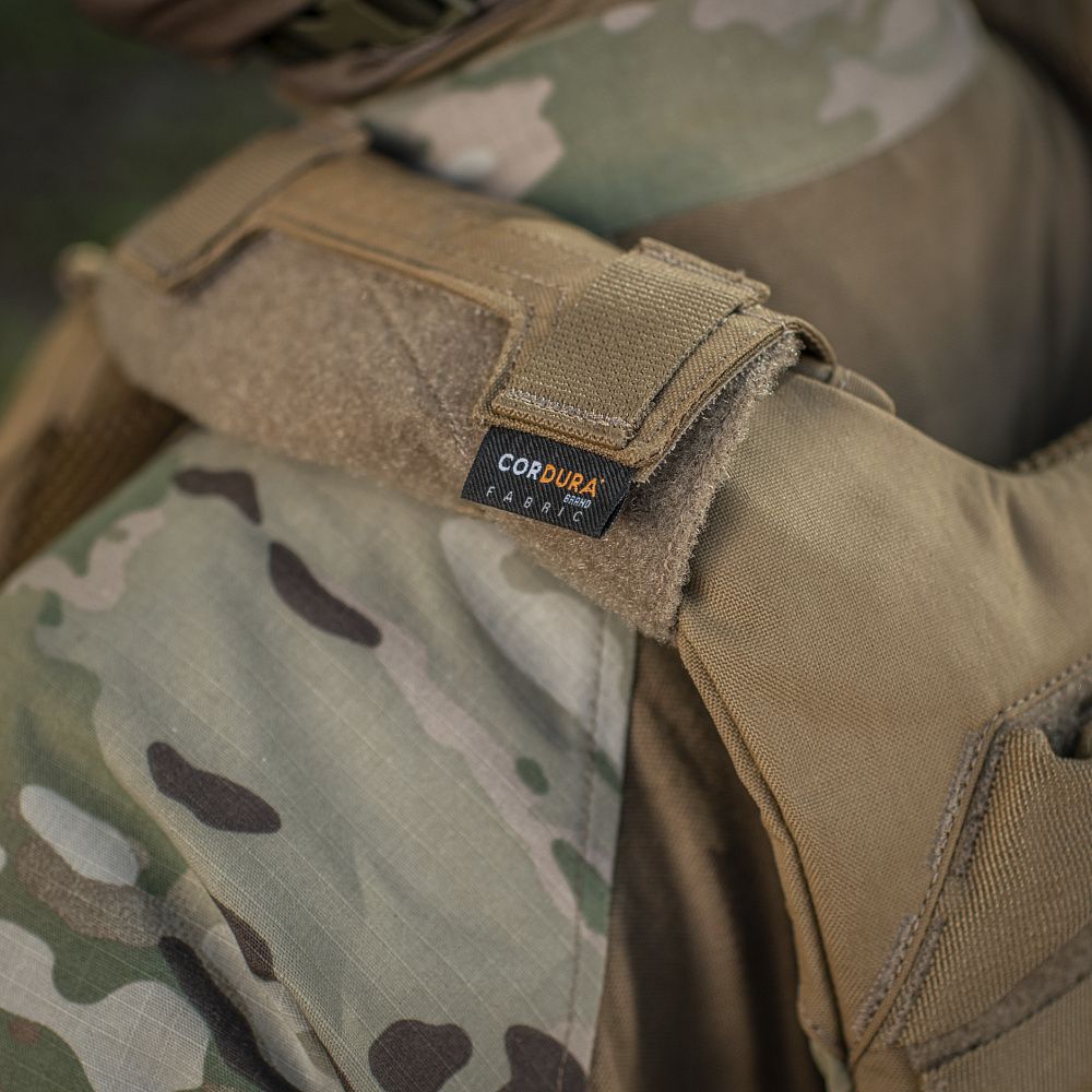 Плитоноска виготовлена з високоякісного матеріалу Cordura 500D – надміцної тканини, стійкої до стирання і високих навантажень. З внутрішньої сторони є вставки з 3D сітки, які забезпечують амортизацію та циркуляцію повітря. Ергономічні плечові лямки зручні у використанні й органічно повторюють контури тіла. Скелетоподібний камербанд значно зменшує вагу виробу і при необхідності дозволяє розмістити підсумки.