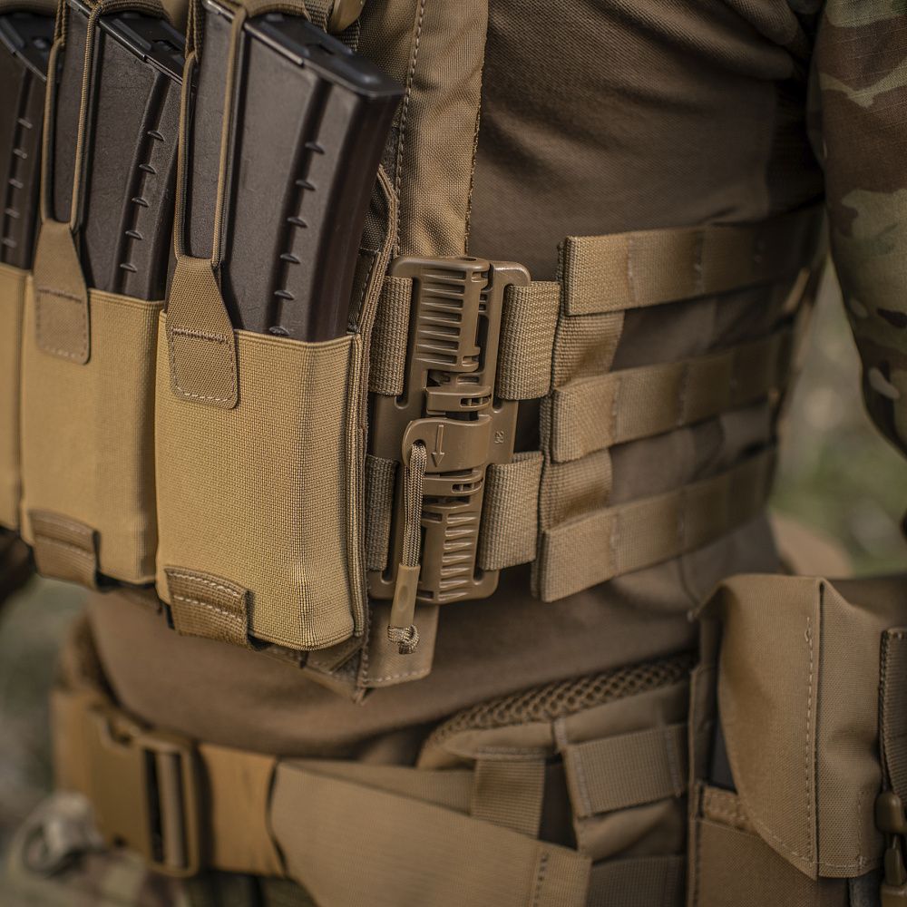 Знизу бронежилета знаходиться швидкознімний модуль з 4 підсумками, які надійно утримують магазини. Щоб уникнути випадкового зривання з основи Velcro, він кріпиться до строп на плитоносці за допомогою карабінів Woojin.