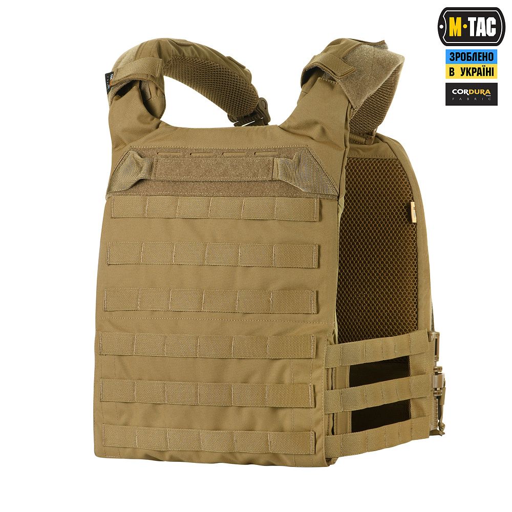 Плитоноска виготовлена з високоякісного матеріалу Cordura 500D – надміцної тканини, стійкої до стирання і високих навантажень. З внутрішньої сторони є вставки з 3D сітки, які забезпечують амортизацію та циркуляцію повітря. Ергономічні плечові лямки зручні у використанні й органічно повторюють контури тіла. Скелетоподібний камербанд значно зменшує вагу виробу і при необхідності дозволяє розмістити підсумки.