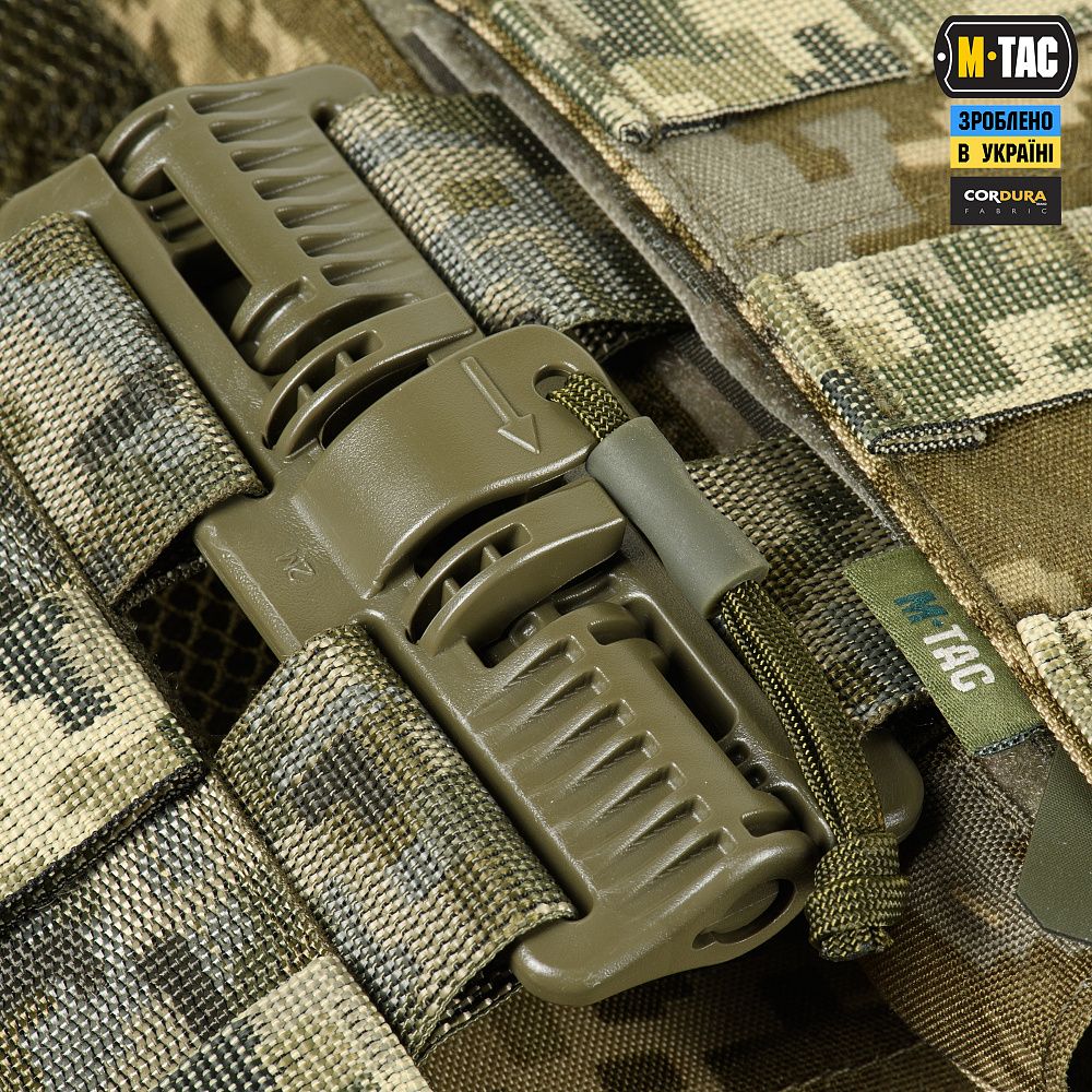 Нове покоління M-Tac плитоноски Cuirass Fast QRS XL оснащене спеціальною Molle панеллю, що дозволить розмістити підсумки, кобури, аптечки, органайзери та інше спорядження. Щоб уникнути випадкового зривання з основи Velcro, вона кріпиться до строп на плитоносці за допомогою карабінів Woojin.