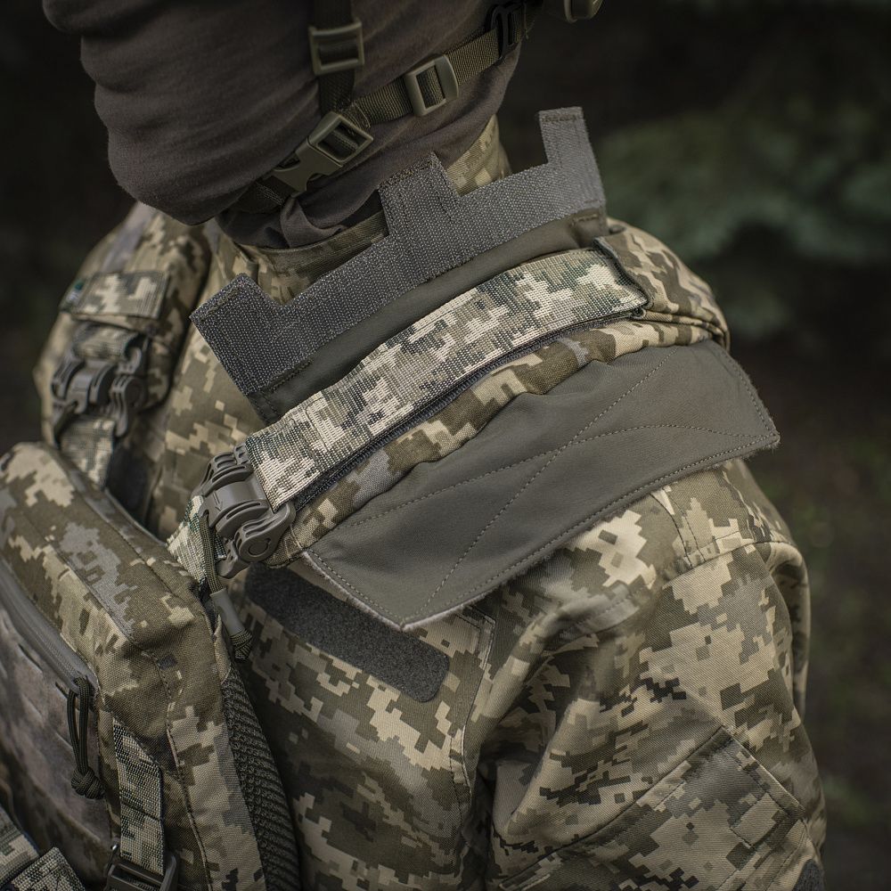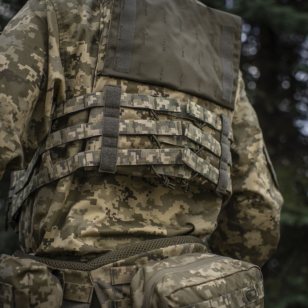 Ззаду є класичний молле-інтерфейс та евакуаційна стропа, яка в похідному положенні фіксується до спинки панелями Velcro.