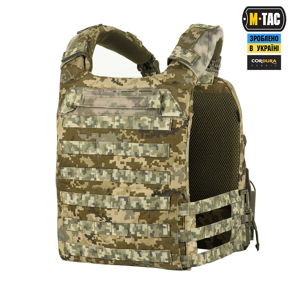 Плитоноска виготовлена з високоякісного матеріалу Cordura 500D – надміцної тканини, стійкої до стирання і високих навантажень. З внутрішньої сторони є вставки з 3D сітки, які забезпечують амортизацію та циркуляцію повітря. Ергономічні плечові лямки зручні у використанні й органічно повторюють контури тіла. Скелетоподібний камербанд значно зменшує вагу виробу і при необхідності дозволяє розмістити підсумки.