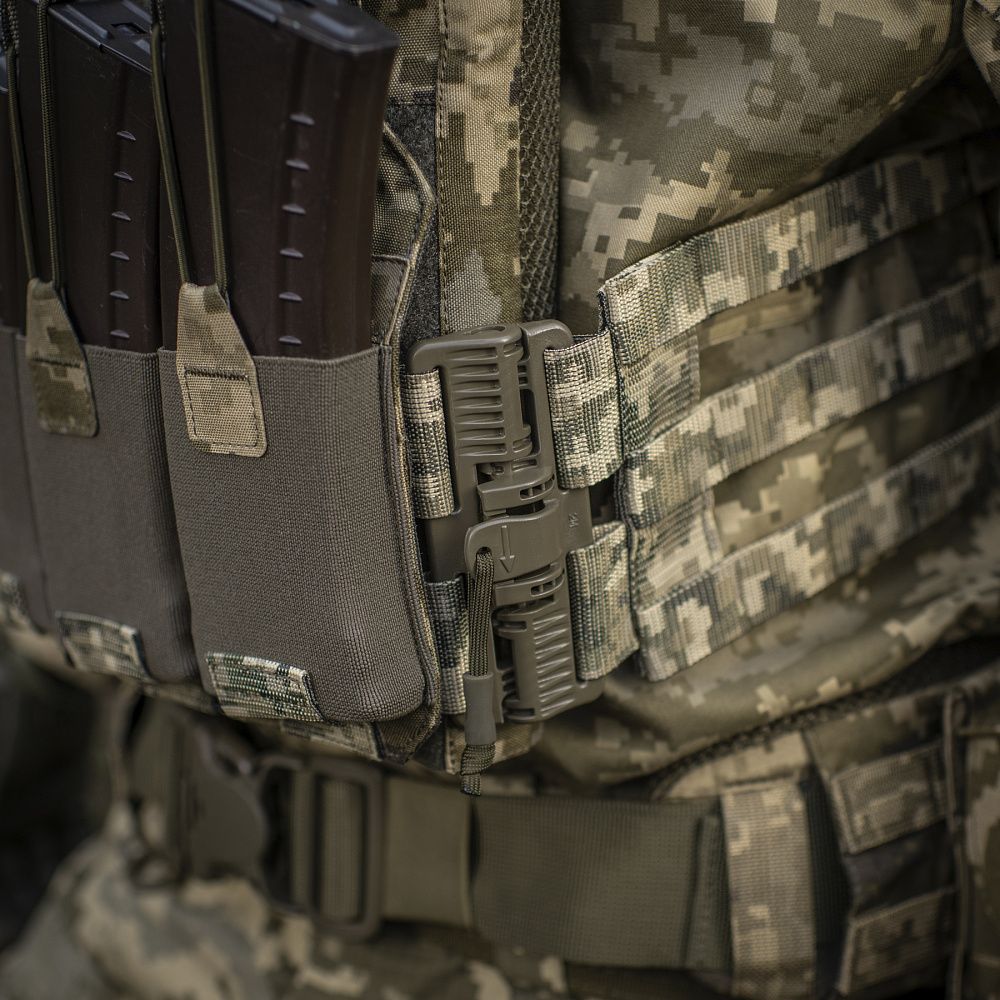 Знизу бронежилета знаходиться швидкознімний модуль з 4 підсумками, які надійно утримують магазини. Щоб уникнути випадкового зривання з основи Velcro, він кріпиться до строп на плитоносці за допомогою карабінів Woojin.