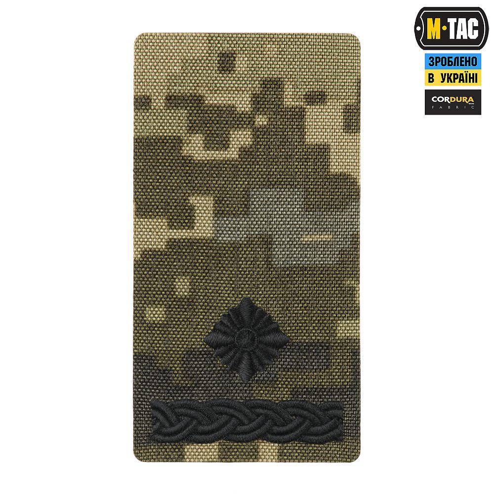 Погон виконаний на основі матеріалу Cordura (в патерні ММ14) - міцного матеріалу, стійкого до механічних пошкоджень. Знаки розрізнення нанесені машинною вишивкою.