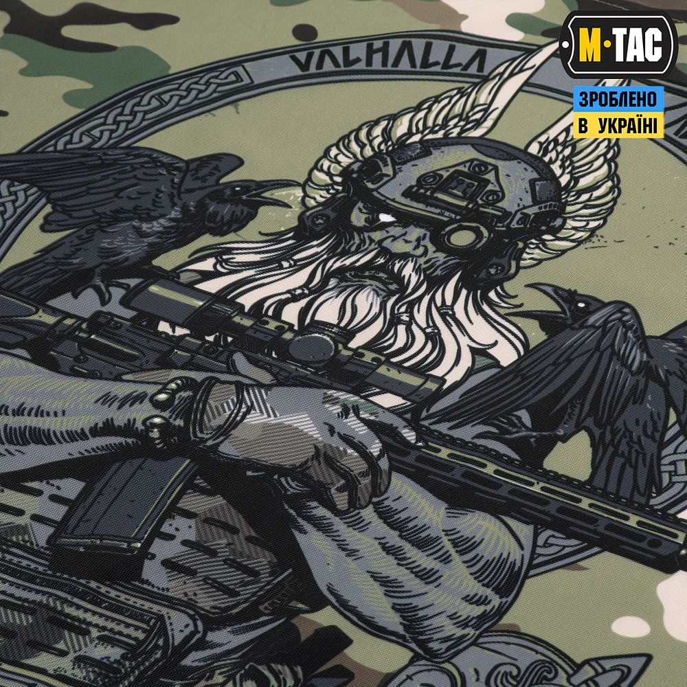 На принті зображений рішуче налаштований Одін, який змінив свій традиційний спис (Гунгнір) на гвинтівку AR-15. У сучасному бойовому спорядженні та в шоломі з ПНБ він готовий вести своїх воїнів в останню битву. На плечі Одіна сидять його вірні супутники – ворони Хугін (думки) і Мунін (пам’ять), які щодня облітають 9 світів і повідомляють верховному богу про все, що відбулося.