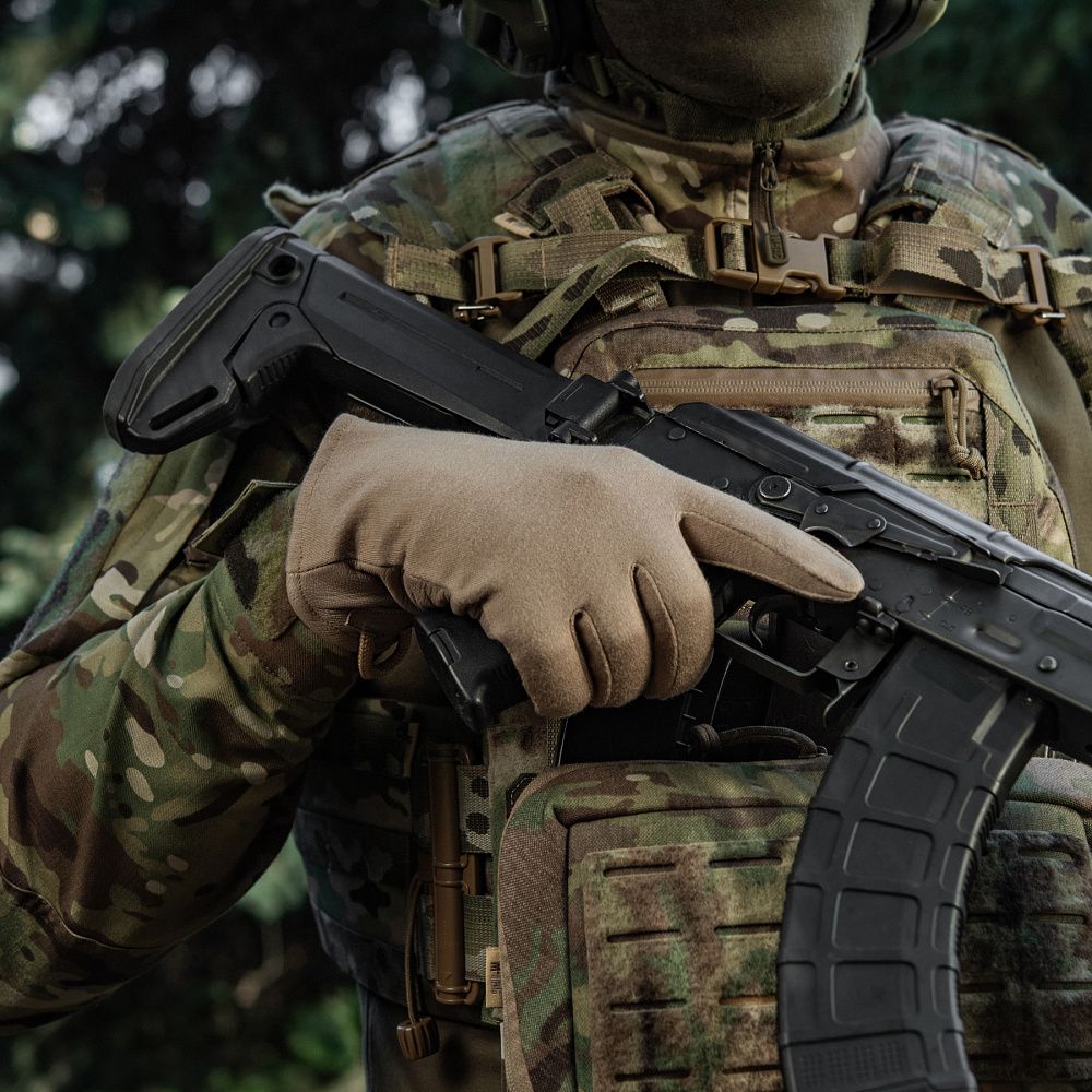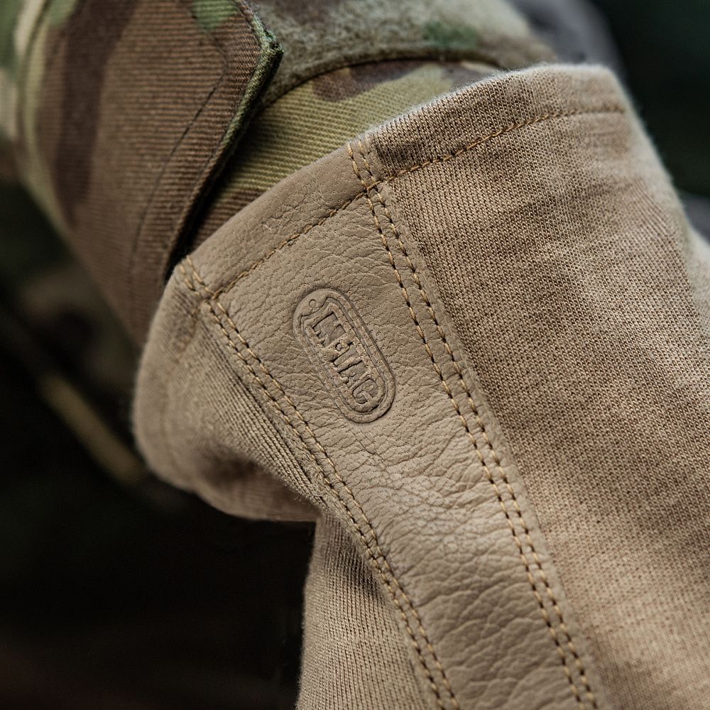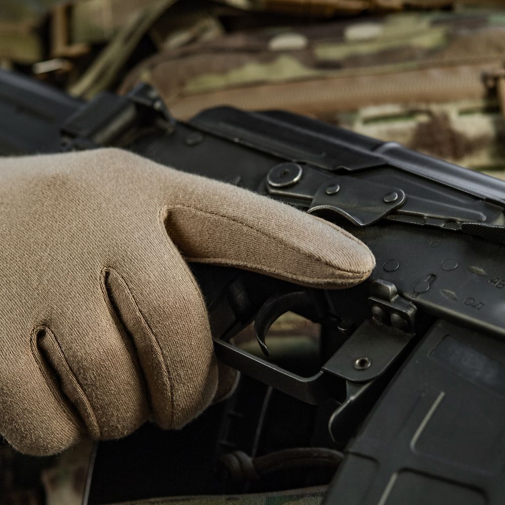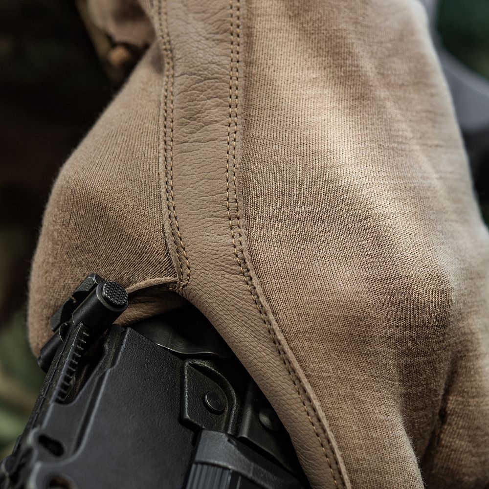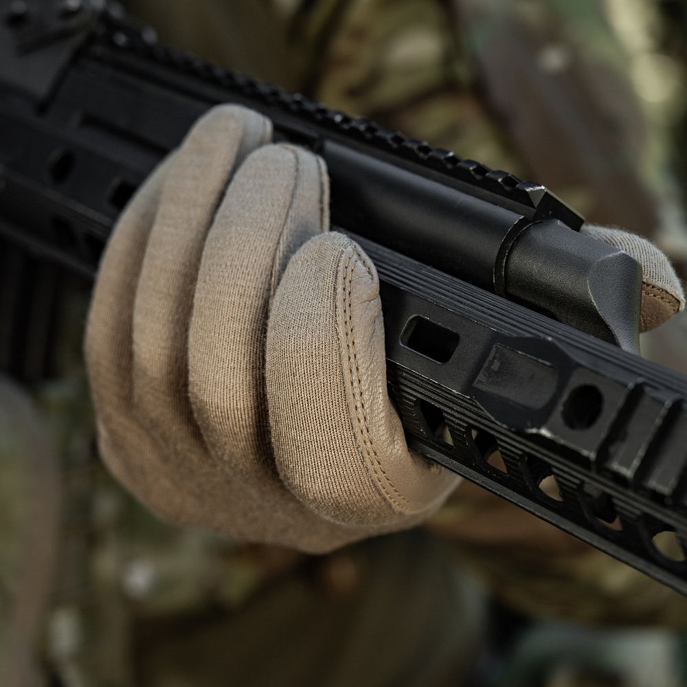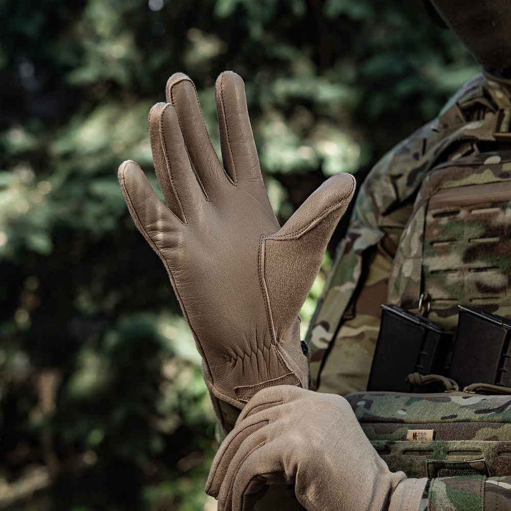 Нижня частина рукавичок виготовлена з натуральної шкіри. Цей матеріал володіє відмінними теплоізоляційними, водостійкими та дихаючими властивостями. Використання натуральної шкіри на нижній частині рукавичок (долоня, внутрішня частина пальців) запобігатиме ковзанню зброї, або ж інших предметів у руці (ліхтарик, ніж тощо).
