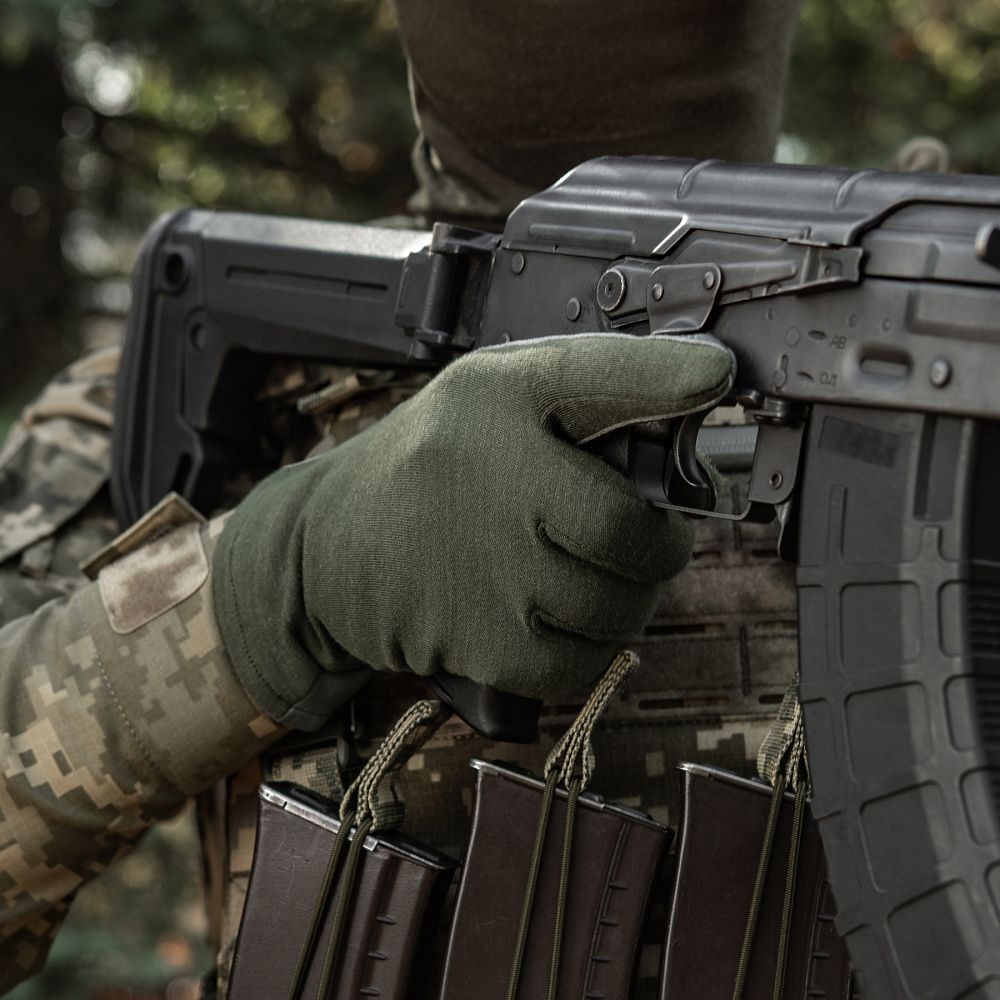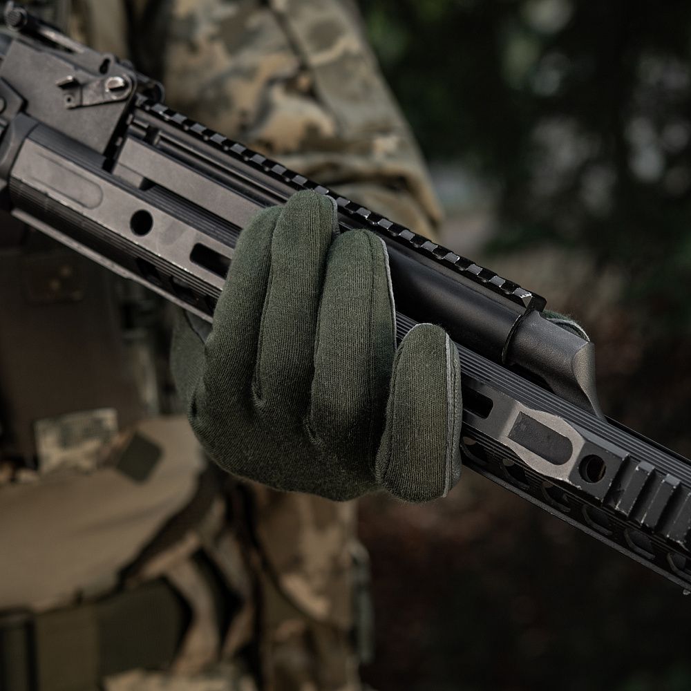 Нижня частина рукавичок виготовлена з натуральної шкіри. Цей матеріал володіє відмінними теплоізоляційними, водостійкими та дихаючими властивостями. Використання натуральної шкіри на нижній частині рукавичок (долоня, внутрішня частина пальців) запобігатиме ковзанню зброї, або ж інших предметів у руці (ліхтарик, ніж тощо).