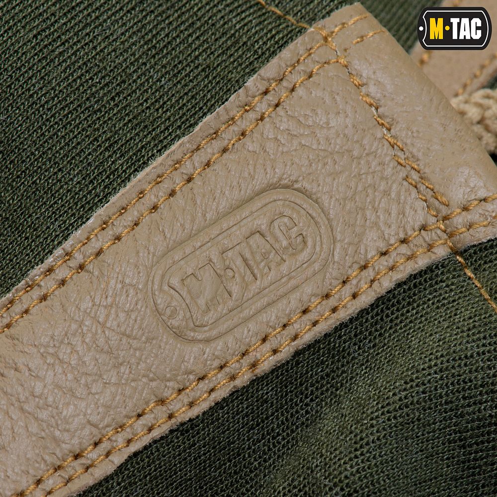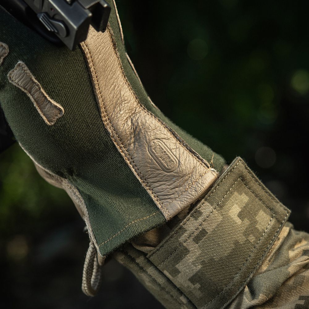 Нижня частина рукавичок, а також нашиті декоративні елементи (фаланги пальців) виготовлені з натуральної шкіри. Цей матеріал володіє відмінними теплоізоляційними, водостійкими та дихаючими властивостями. Використання натуральної шкіри на нижній частині рукавичок (долоня, внутрішня частина пальців) запобігатиме ковзанню зброї, або ж інших предметів у руці (ліхтарик, ніж тощо).