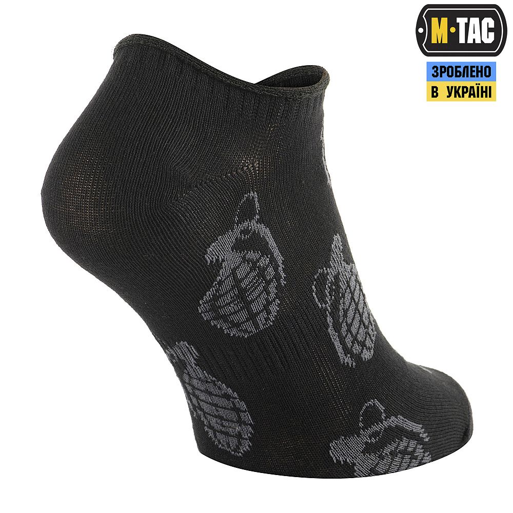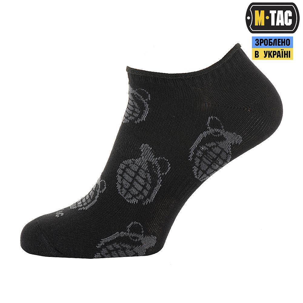 Виготовлені з легкого дихаючого матеріалу: 85% бавовна, 10% поліестер, 5% еластан. Такий склад тканини забезпечує оптимальну терморегуляцію, в результаті якої шкарпетки не парять. Вони мають укорочену конструкцію з ергономічно розташованими точками тиску, що забезпечують оптимальну посадку на нозі, і їх практично не видно у взутті. Зображені гранати придають шкарпеткам оригінального вигляду, а анатомічна форма гарантує комфортне носіння у взутті.