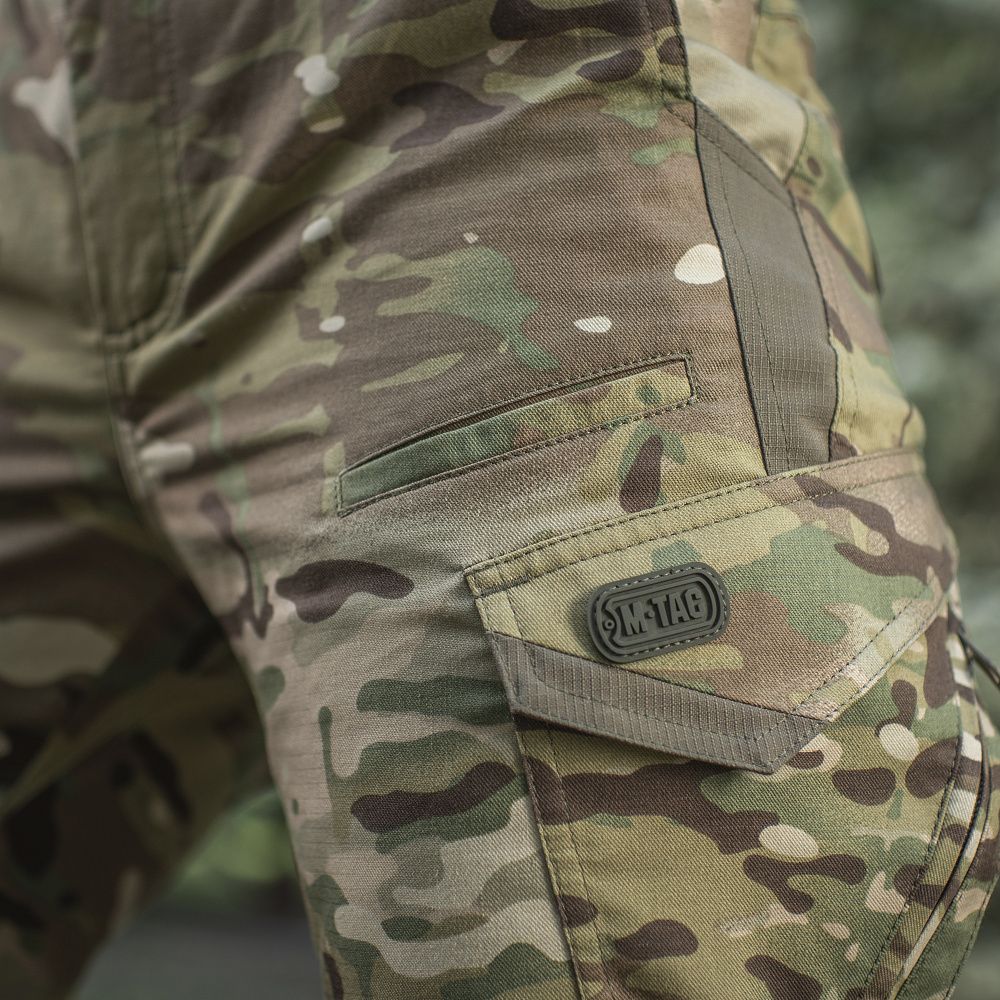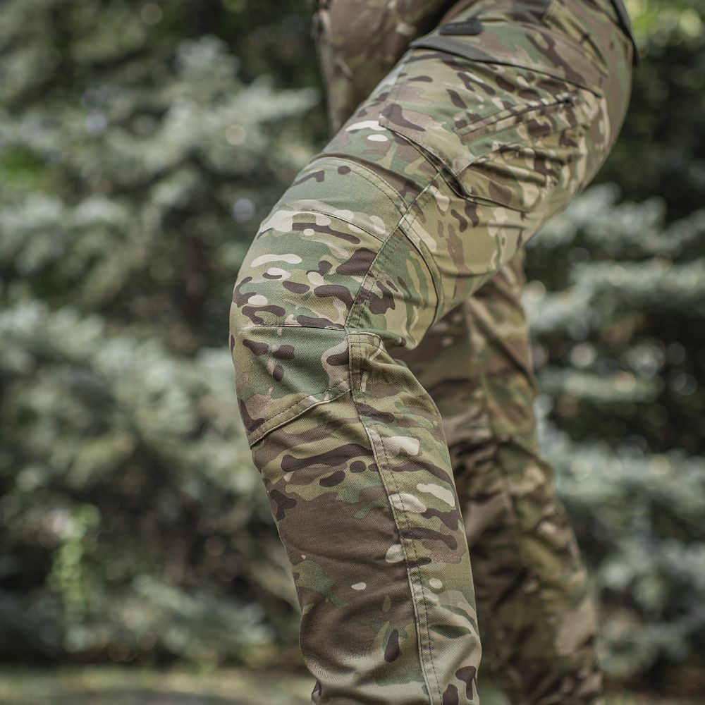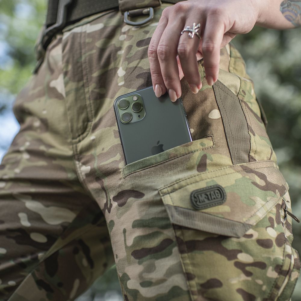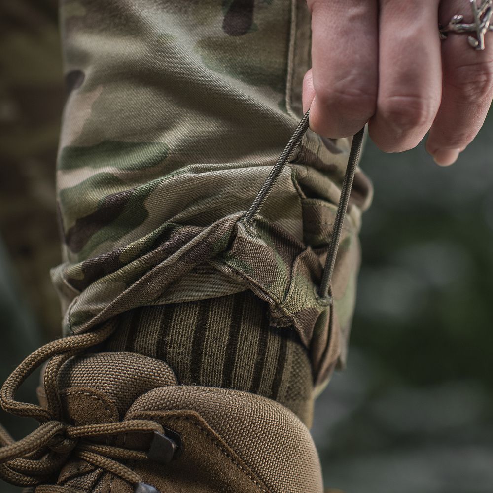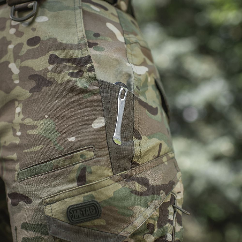 Зручні широкі кишені з посиленими вставками з Cordura (R) вмістять необхідний мінімум речей. Конструктивною особливістю штанів є еластичний «тунельний» пояс, за допомогою якого штани регулюються по об’єму талії. Спереду нижче пояса є два D-кільця для кріплення додаткового спорядження. Низ штанин регулюється по ширині за допомогою еластичного шнура та велкро клапана. Прихований внутрішній відсік для наколінників дає можливість встановлення додаткового захисту.