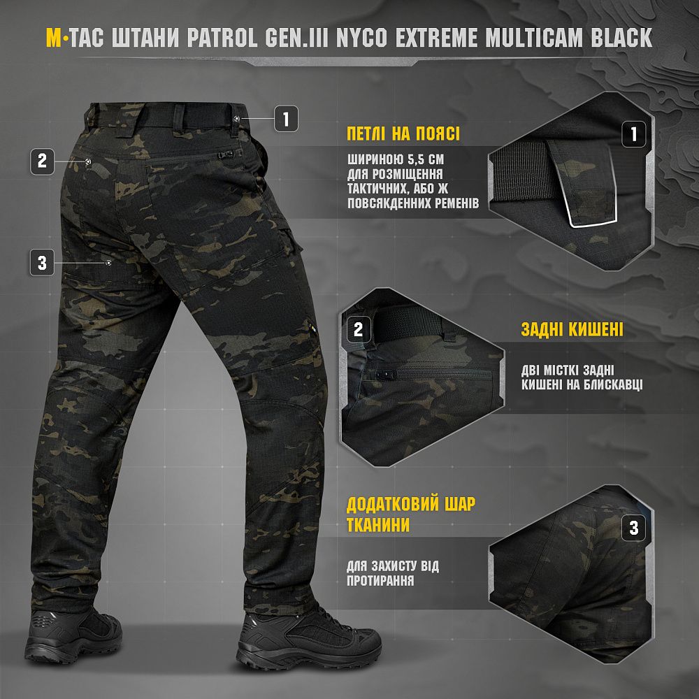 M-TAC ШТАНИ PATROL GEN.III NYCO EXTREME MULTICAM BLACK стануть ідеальним рішенням для будь-яких тактичних завдань, а завдяки високоякісному матеріалу Nyco Extreme, подарують своєму власнику зручність та комфорт.