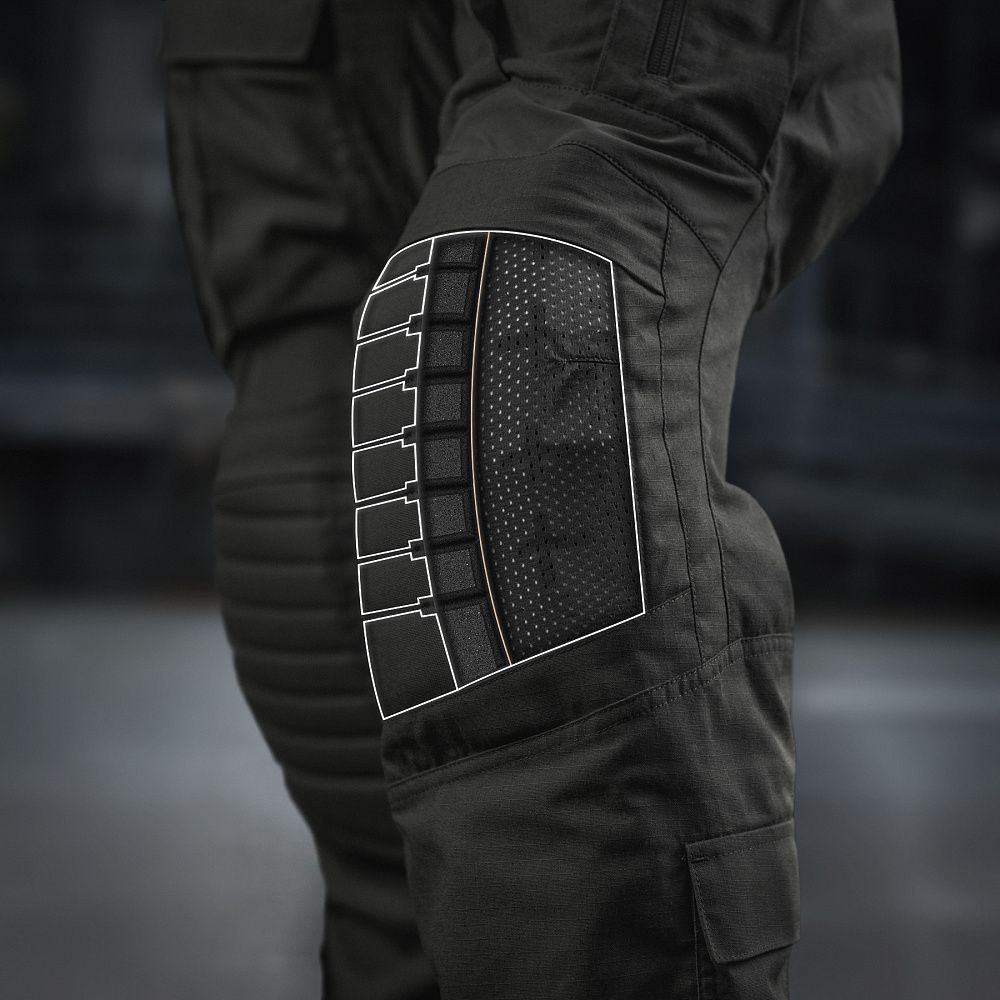 Пошиті із міцного матеріалу NYCO EXTREME (57% нейлон, 43% бавовна) від американської компанії BROOKWOOD. Дана тканина має високі показники міцності, зносостійкості та повітропроникності. Вставки з легкої тканини Flex (90% нейлон, 10% еластан) тягнуться у всіх напрямках (4-way stretch) та гарантують комфорт при активній експлуатації. В області колін дизайнери бренду використали Cordura 500D зі стаціонарно простроченими вставками з EVA-піни товщиною 2-4 мм, що забезпечить ефективний захист колінних суглобів від ударів та механічних пошкоджень. Дана модель додатково комплектується наколінниками.