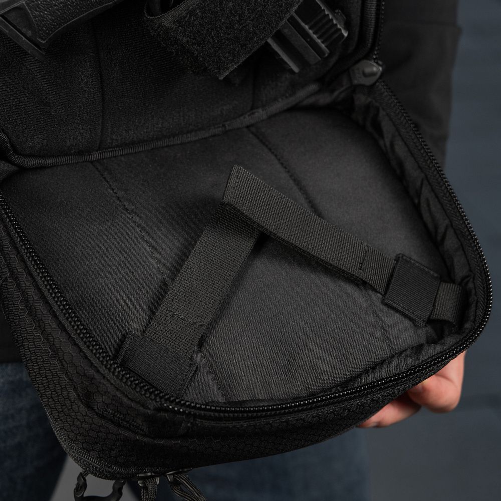 Передня кишеня сумки оснащена EDC органайзером, для розміщення необхідних речей (блокноту, повербанку, ліхтарику тощо). Задня частина сумки призначена для розміщення зброї та оснащена системою швидкого скидання (завдяки конструкції, розташовувати зброю в сумці буде зручно як для правші, так і для лівші).