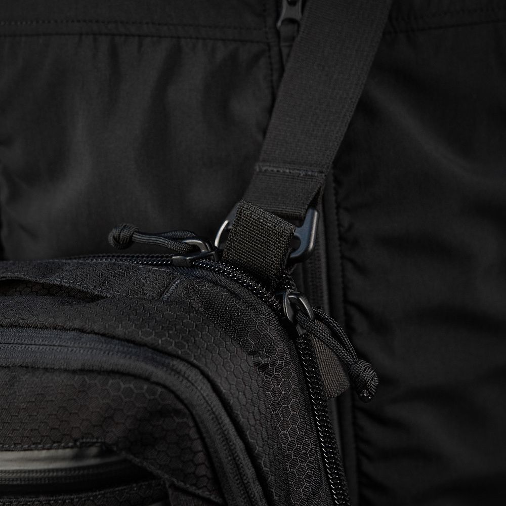 M-TAC СУМКА EDC BAG ELITE HEX можна носити як через праве, так і через ліве плече, це можливо завдяки ручці яка оснащена гейткіперами. Для того, щоб носити сумку на лівому плечі (правому боці), варто змінити стандартне положення лівого гейткіпера прикріпивши його до спеціальної стропи, яка знаходиться нижче. Дії стосовно носіння сумки на правому плечі (лівому боці) здійснюються дзеркально.