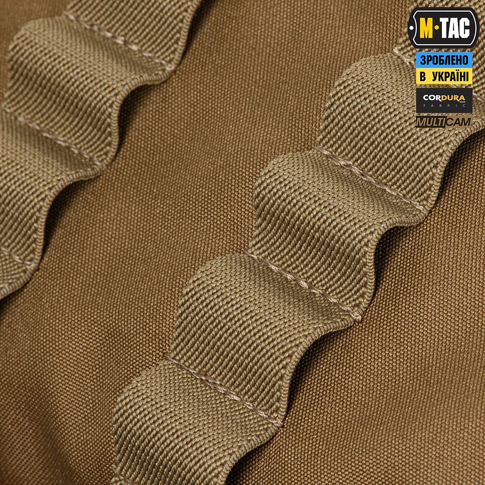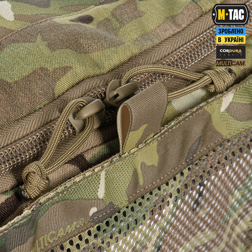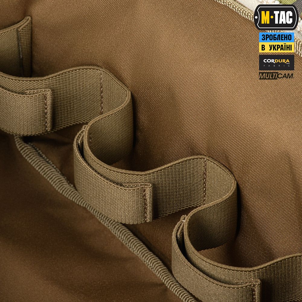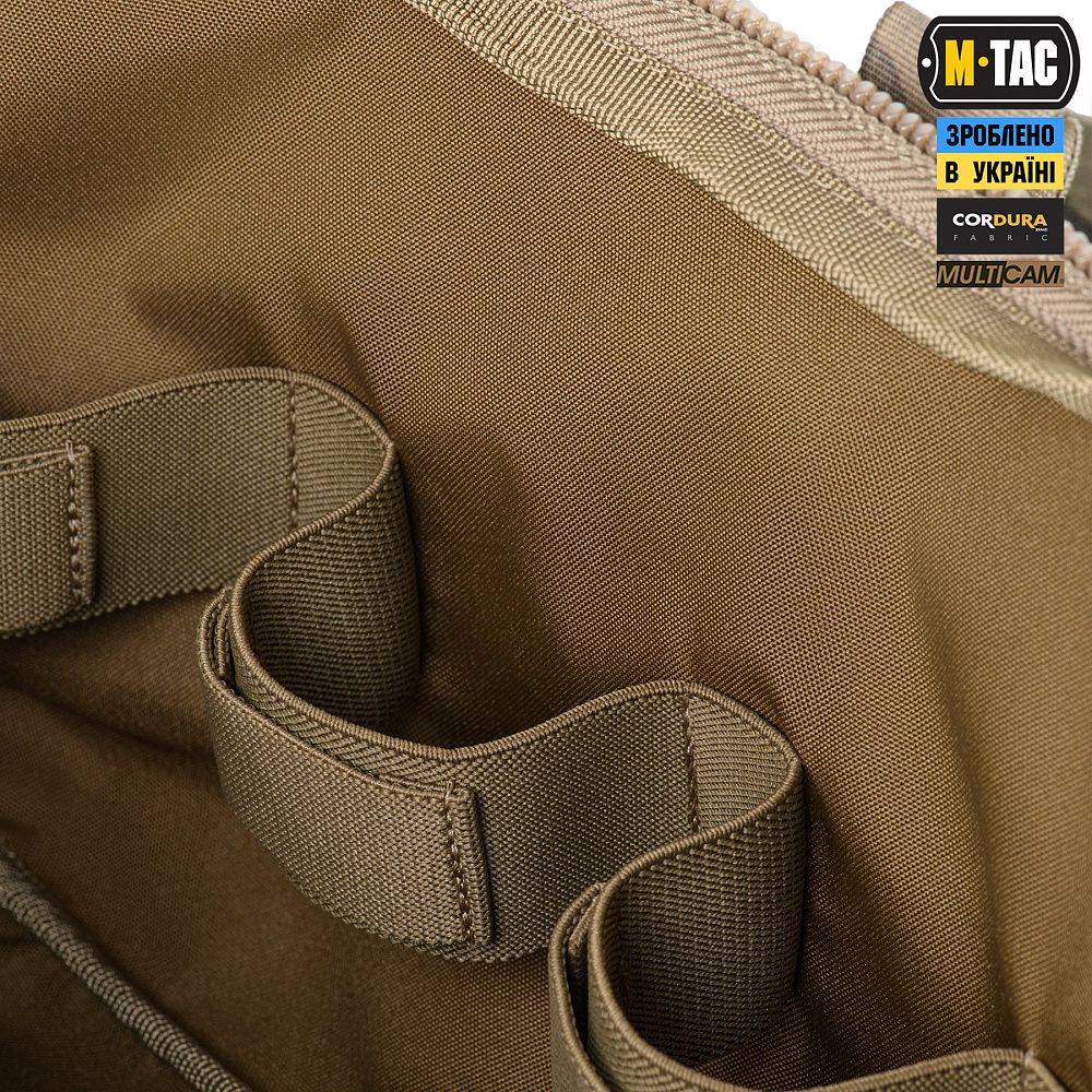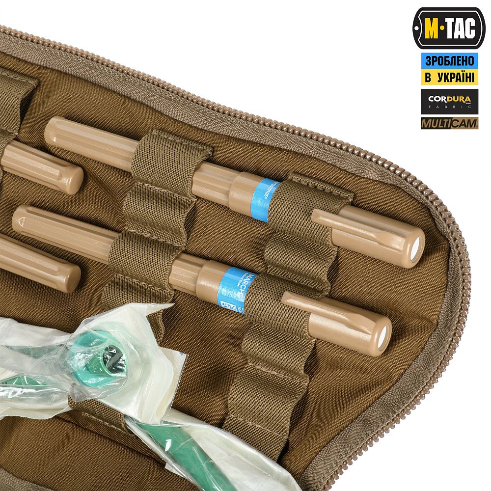 Сумка виготовлена з Cordura 500D - якісного та зносостійкого матеріалу, що забезпечує захист від механічних пошкоджень та тривалий термін експлуатації. Стропи-фіксатори інтегрованих підсумків, ремінь, тримач для ножиць та стропи для закріплення індивідуальних нош - виготовлені зі стропи Mil-Spec (Original MultiCam®). Фастекси та застібки-блискавки сумки - від світових лідерів з виробництва фурнітури WOOJIN та YKK.