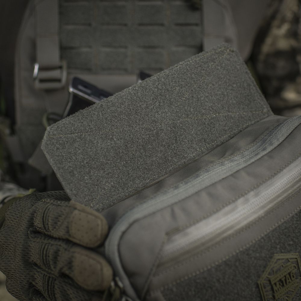 Сумка-напашник має 3 відділення, які дозволяють вмістити речі першої необхідності. В даній генерації дизайнери бренду передбачили фронтальну велкро панель, по центру якої розміщений стильний шестикутник із логотипом бренду. Додатково в задню кишеню сумки-напашника можна встановити М-Тас балістичний пакет 1А класу (в комплекті не йде). Знизу виробу є еластичне кріплення для турнікета.