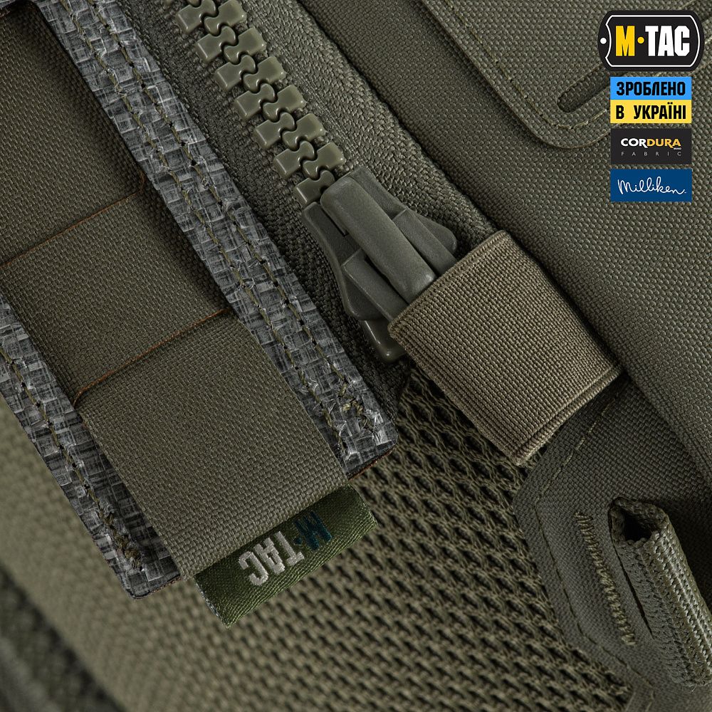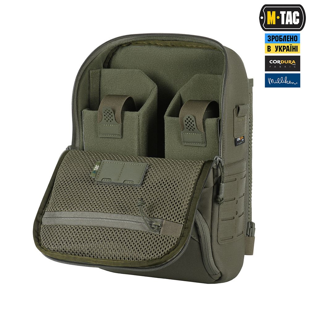 Знизу сумки-наплічника розміщено відділ для окулярів, оснащений еластичним фіксатором, а також невелику зовнішню кишеню на застібці-блискавці. На передній та бічних частинах сумки-наплічника розташовані Molle Laser Cut панелі, розраховані для розміщення додаткового спорядження. На задній частині передбачено велику сітчасту кишеню.