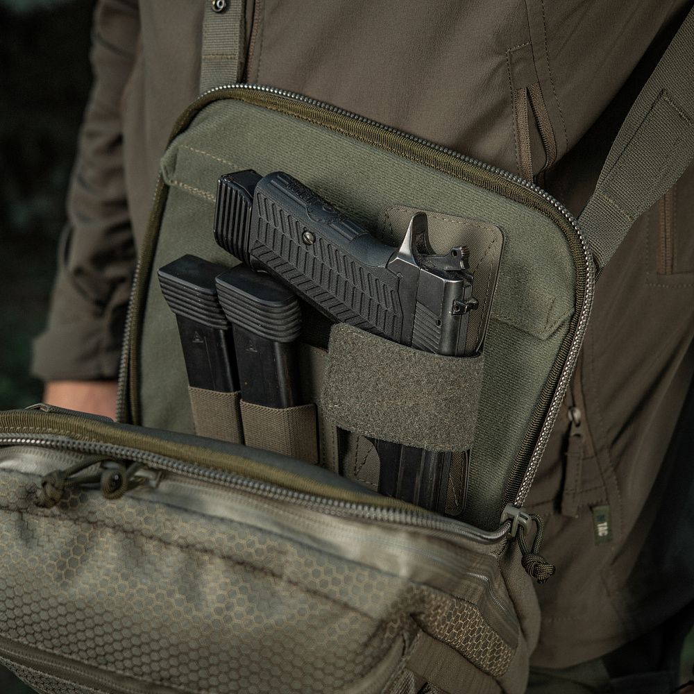 Сумка має три відділення, розташування і розміри яких ретельно продумані. Відділ для прихованого носіння зброї оснащений стінкою з велкро велюру, що дозволяє прикріпити кобуру-вставку, кріплення для магазинів чи будь-які інші модульні вставки з велкро. Основне відділення сумки вмістить документи формату A4, невеликий ноутбук, планшет і схожі за розміром предмети. Два відділення на блискавці оснащені додатковими внутрішніми кишенями та відмінно підійдуть для повсякденних речей.