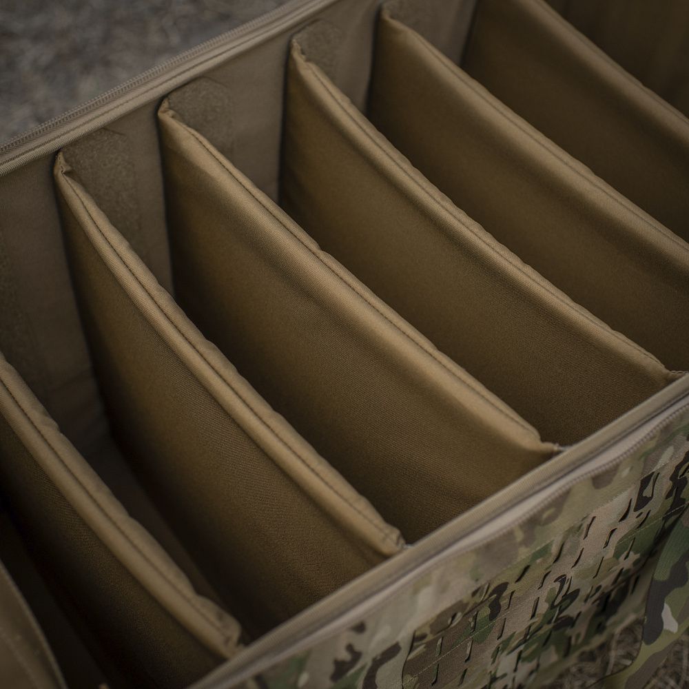 Основне відділення відкривається за принципом валізи та поділене на окремі секції для зручного розміщення семи дронів. Якщо зняти внутрішні відсіки, то сумка-рюкзак дозволяє вмістити 15 дронів без батарей. Зверху рюкзака дизайнери бренду передбачили спеціальнe відділення для додаткових пристроїв: пульта керування, акумуляторів, окулярів, кабелів тощо. З боків виріб оснащений системою Molle Laser Cut, що виготовлена з Cordura Squadron і дозволяє прикріпити додаткове спорядження. На фронтальній частині рюкзака є шнурівка з еластичної резинки з фіксатором, яка дає можливість переносити куртку, маскувальну сітку або інші подібні речі. Велкро панель призначена для ваших улюблених ідентифікаторів і патчів.