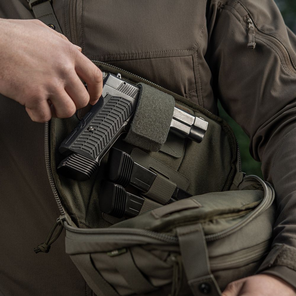 - відділення для прихованого носіння зброї з системою швидкого відкривання та можливістю прикріпити модульні вставки; - два відділення на блискавці призначені для повсякденних речей; - ремінь сумки має фастекс швидкого скидання і регулюється по довжині; - на спинці є відкрита кишеня для смартфона; |