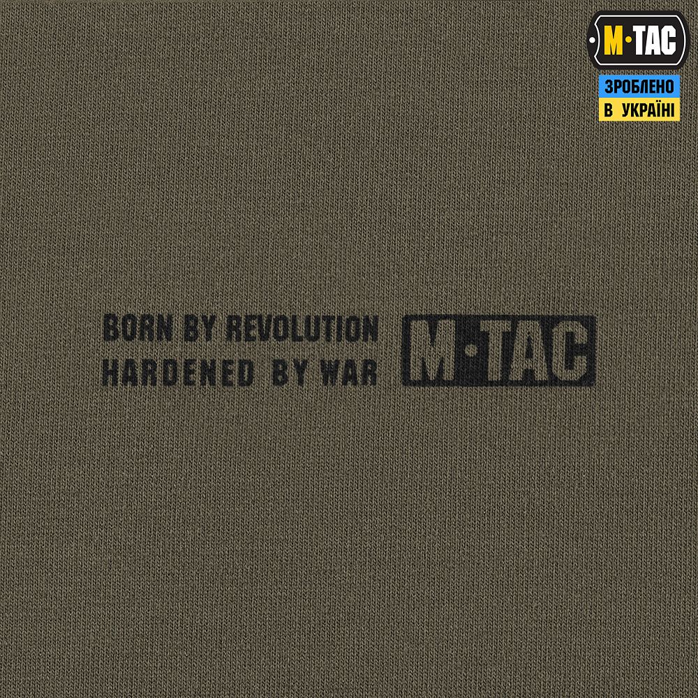 На грудях світшота нанесено логотип М-Тас, а також гасло бренду: Born by Revolution – Hardened by War, що в перекладі означає "Народжений революцією – загартований війною".