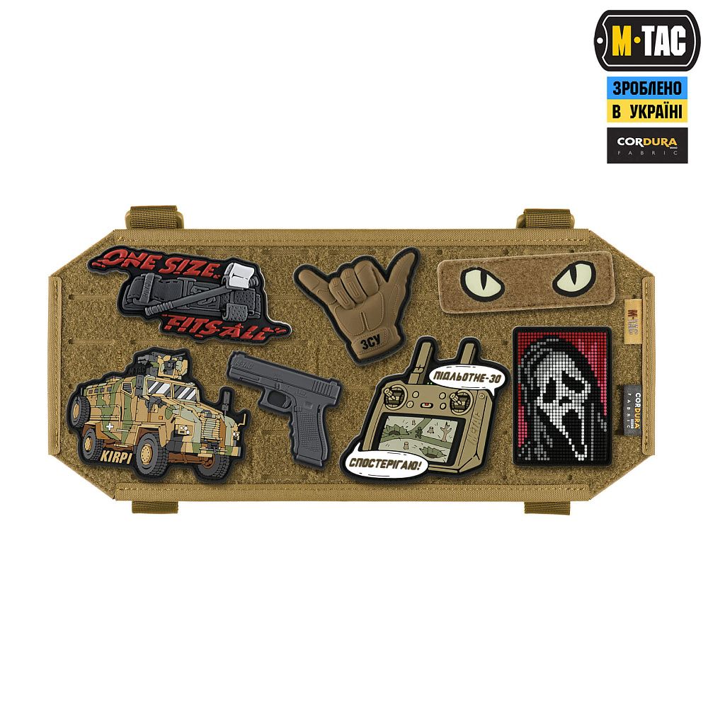 Передня частина панелі виконана з велкро полотна, на яке нашивки легко чіпляються та надійно тримаються (нашивки на зображенні – є демонстрацією можливого розташування, в комплекті не йдуть).