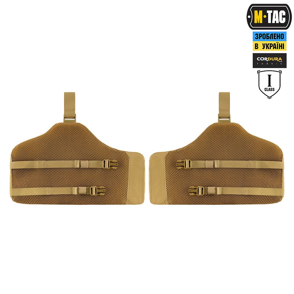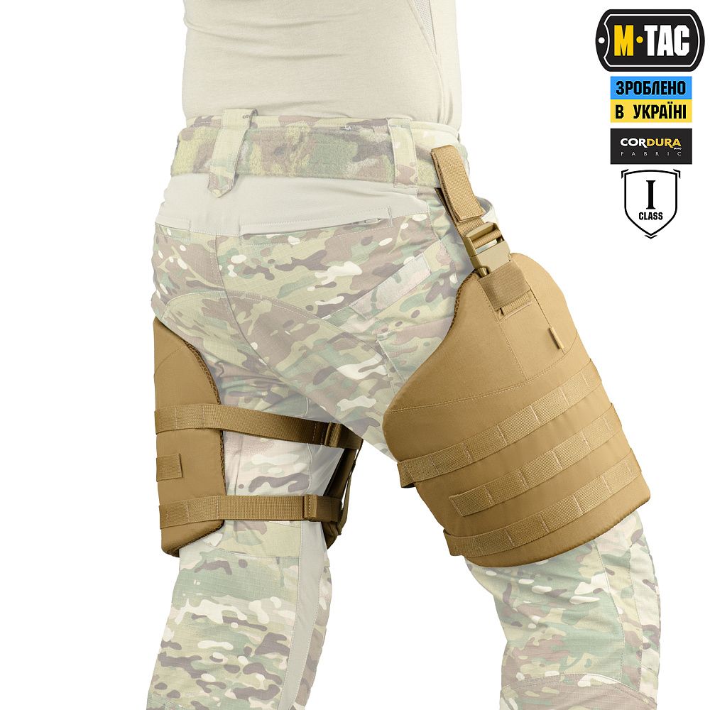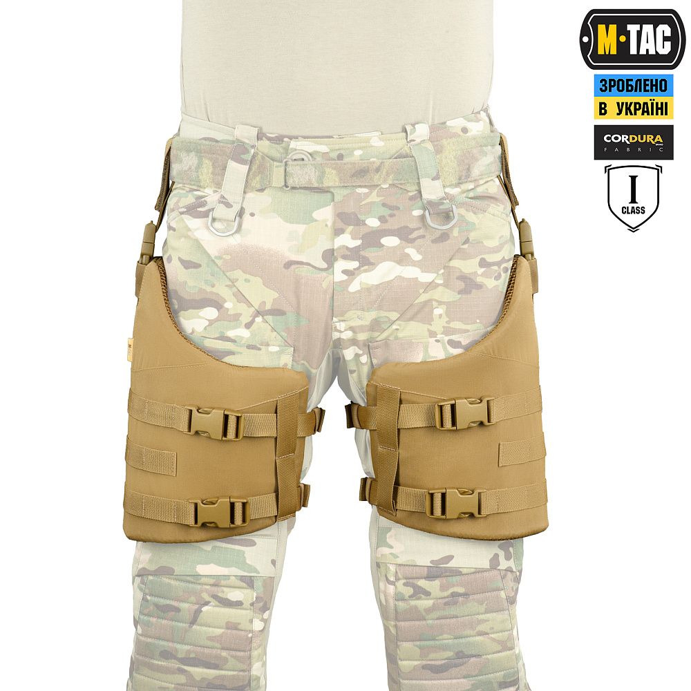 Стегновий захист виготовлений з Cordura 500D - міцного матеріалу, стійкого до механічних пошкоджень та високих навантажень. Внутрішня частина модуля виконана з 3D сітки, яка забезпечує амортизацію, гарну терморегуляцію та комфорт при використанні. Також, стегнові накладки укомплектовані балістичними пакетами 1-го класу, які захищають від рикошетів та уламків. Бронепакети зроблені з надвисокомолекулярного поліетилену та відповідають STANAG 2920 з показником протиуламкової стійкості V-50 близько 580м/с.