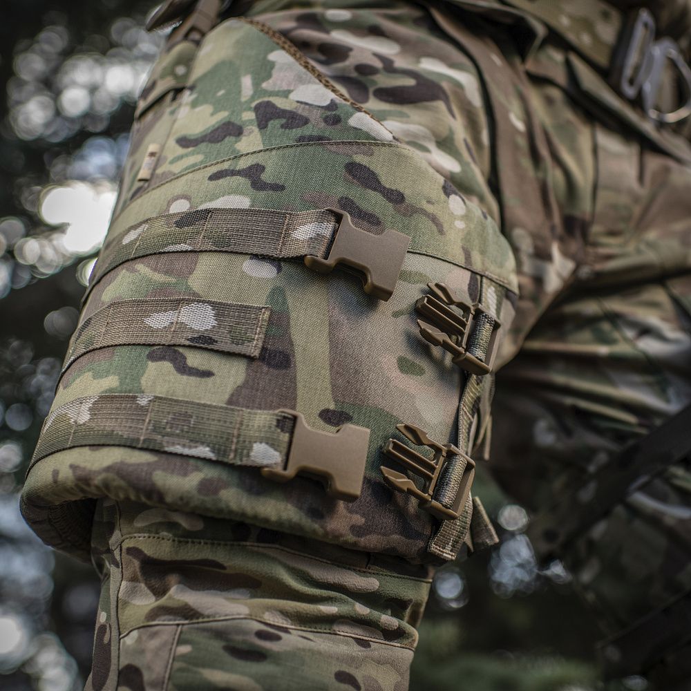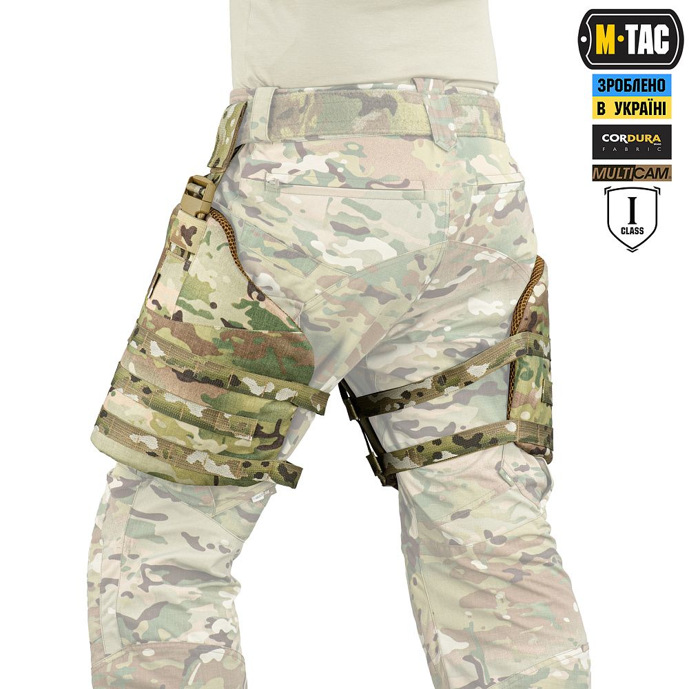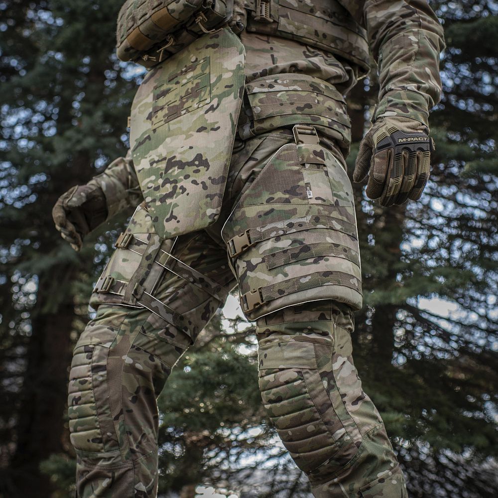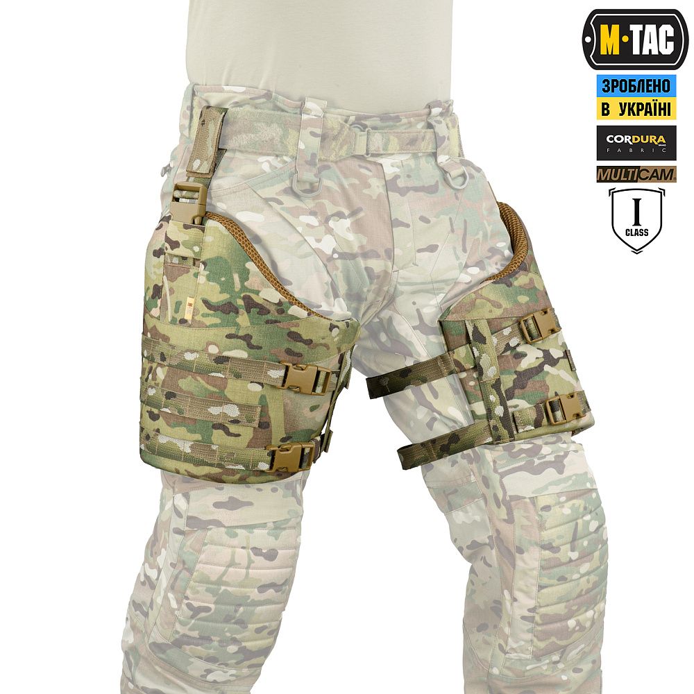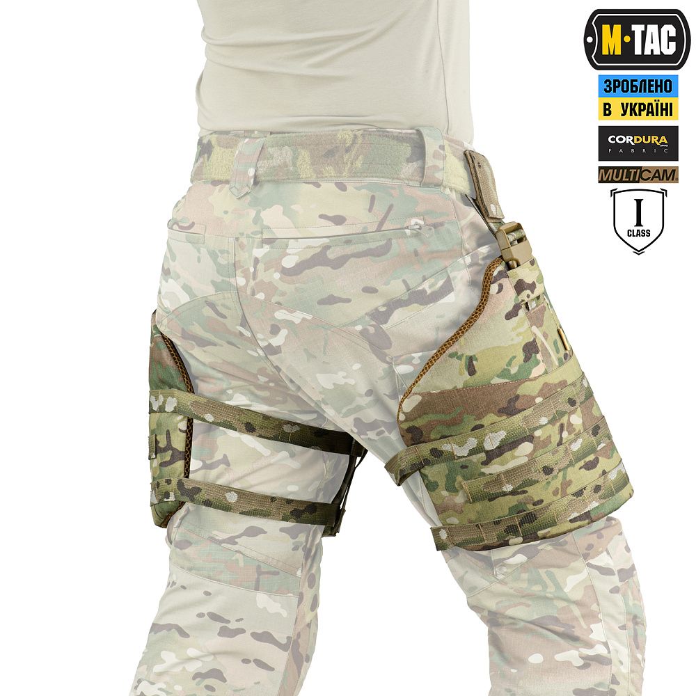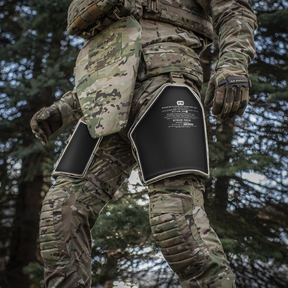 Стегновий захист виготовлений з Cordura 500D - міцного матеріалу, стійкого до механічних пошкоджень та високих навантажень. Внутрішня частина модуля виконана з 3D сітки, яка забезпечує амортизацію, гарну терморегуляцію та комфорт при використанні. Також, стегнові накладки укомплектовані балістичними пакетами 1-го класу, які захищають від рикошетів та уламків. Бронепакети зроблені з надвисокомолекулярного поліетилену та відповідають STANAG 2920 з показником протиуламкової стійкості V-50 близько 580м/с.