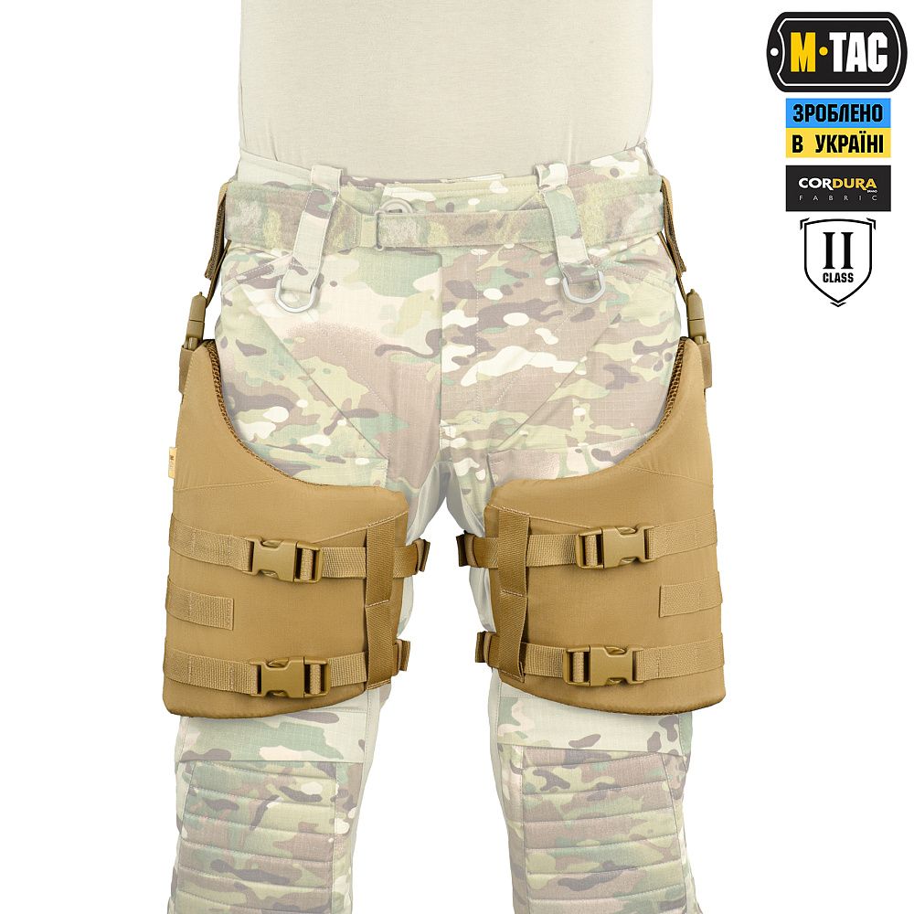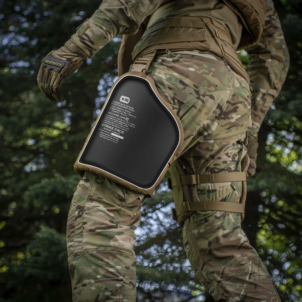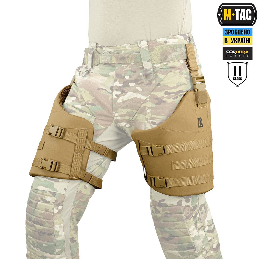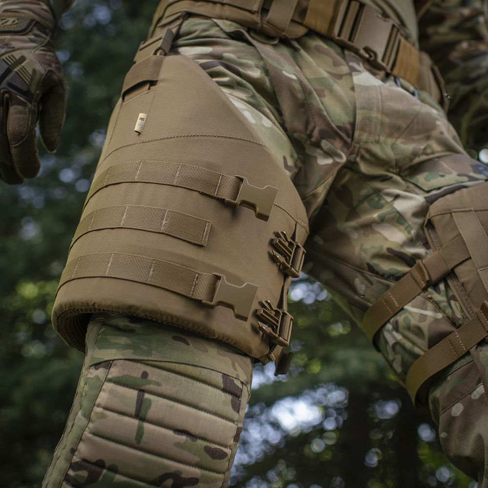 Стегновий захист виготовлений з Cordura 500D - міцного матеріалу, стійкого до механічних пошкоджень та високих навантажень. Внутрішня частина модуля виконана з 3D сітки, яка забезпечує амортизацію, гарну терморегуляцію та комфорт при використанні. Також, стегнові накладки укомплектовані балістичними пакетами 2-го класу, які захищають від рикошетів та уламків. Бронепакети зроблені з надвисокомолекулярного поліетилену та відповідають STANAG 2920 з показником протиуламкової стійкості V-50 близько 758,6 м/с.
