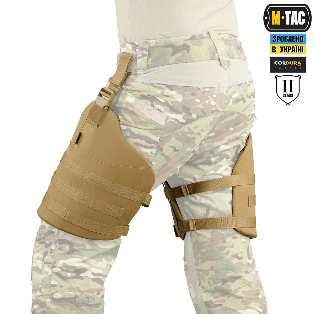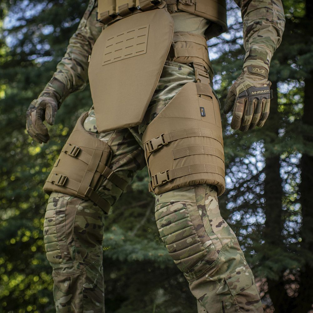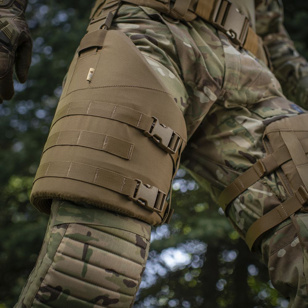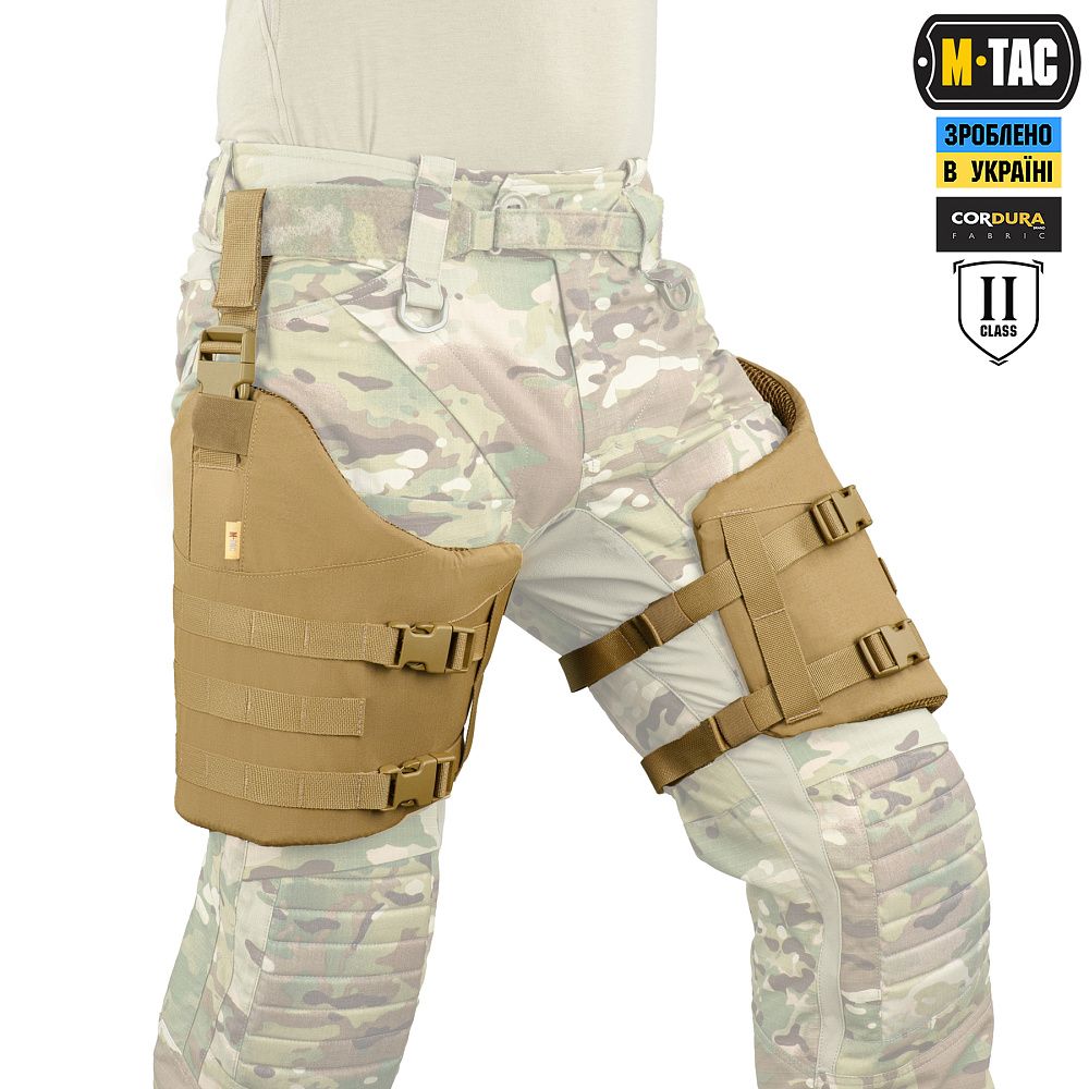 Стегновий захист виготовлений з Cordura 500D - міцного матеріалу, стійкого до механічних пошкоджень та високих навантажень. Внутрішня частина модуля виконана з 3D сітки, яка забезпечує амортизацію, гарну терморегуляцію та комфорт при використанні. Також, стегнові накладки укомплектовані балістичними пакетами 2-го класу, які захищають від рикошетів та уламків. Бронепакети зроблені з надвисокомолекулярного поліетилену та відповідають STANAG 2920 з показником протиуламкової стійкості V-50 близько 758,6 м/с.