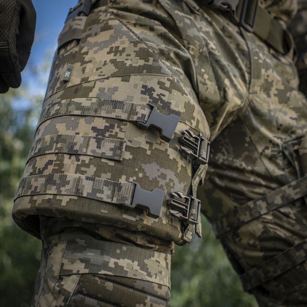 Стегновий захист підходить для використання разом з тактичними поясами WAR BELT ARMOR, WAR BELT ARMOR TEGRIS D-RING COBRA та внутрішнім поясом (поясом штанів). До них він кріпиться за допомогою строп (по технології Mil-Spec) з нашитими велкро-липучками. Стропи додатково оснащені фастексами (виробництво WOOJIN), які за необхідності, дозволяють швидко зняти стегновий захист. На фронтальній частині модуля розташована система MOLLE (виготовлена зі строп по технології Mil-Spec) на яку можна прикріпити додаткове спорядження. На бічних частинах стегнового захисту, розташовуються стропи із фастексами, за допомогою яких, об’єм модуля можна легко налаштувати під ваші параметри. На бічні стропи, з внутрішньої сторони нашиті резинки, завдяки яким, модуль буде максимально щільно прилягати до ноги і не буде завдавати дискомфорту під час експлуатації.